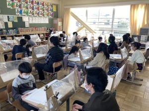 毎年恒例の1年生が6年生の似顔絵にチャレンジしました。1年生と6年生が向き合い(感染対策をしながら)、似顔絵を描くためにじ~っと見つめ合う姿がなんとも微笑ましい。6年生は6年前のことも思い出しながら、1年生が描きやすいように動かないように頑張っていました。今日の絵は卒業式当日に飾られますので、またご覧ください。