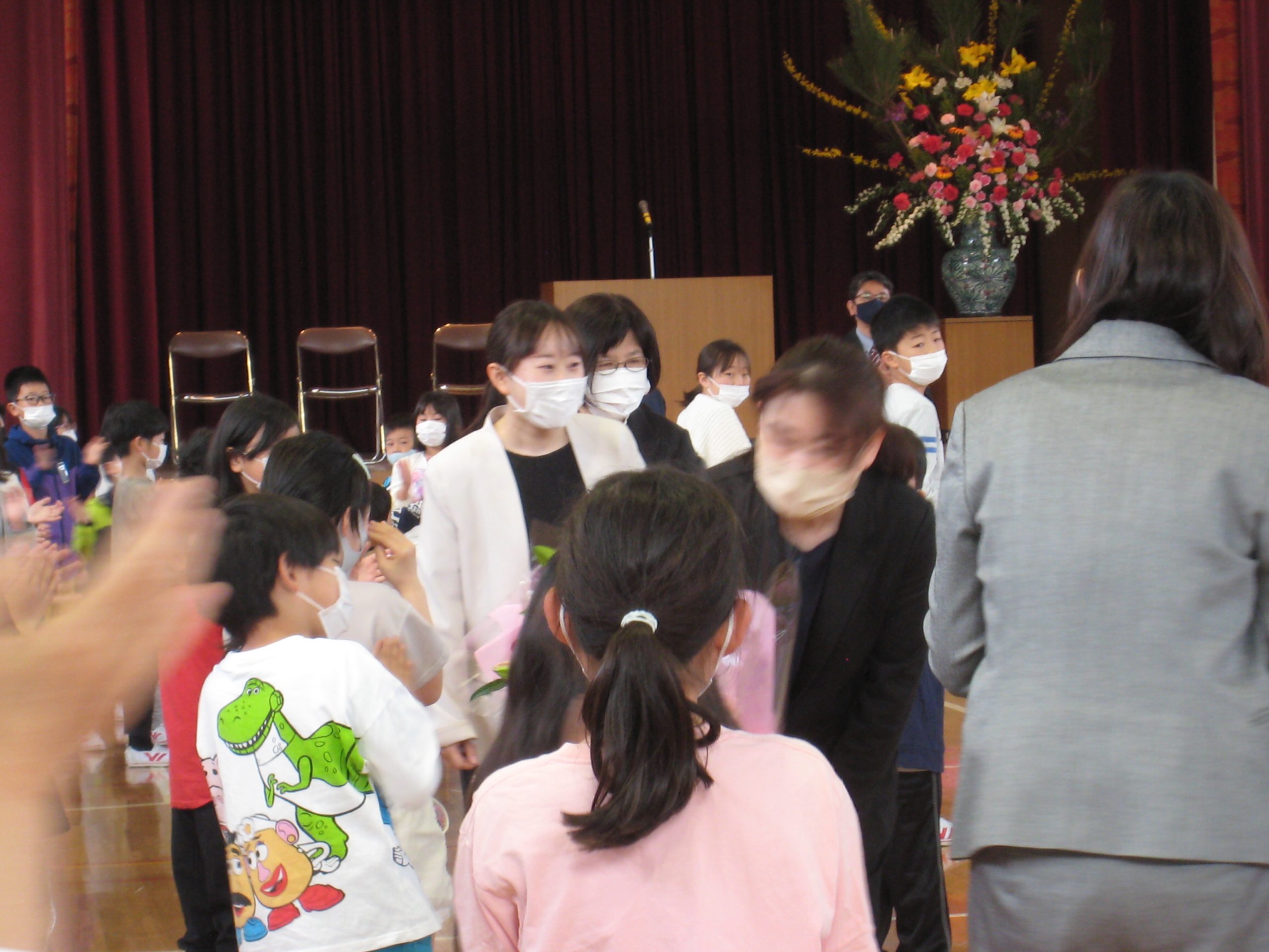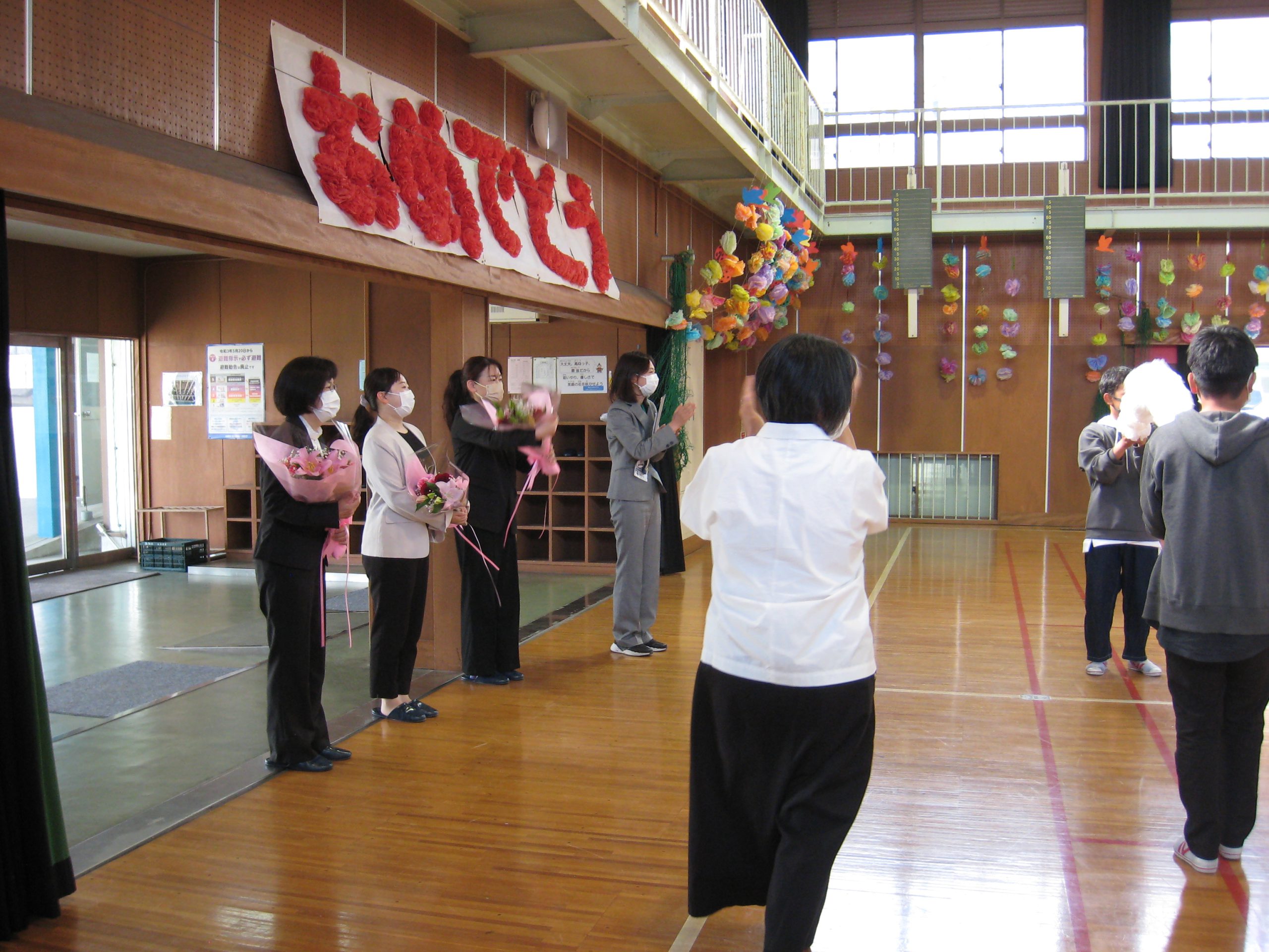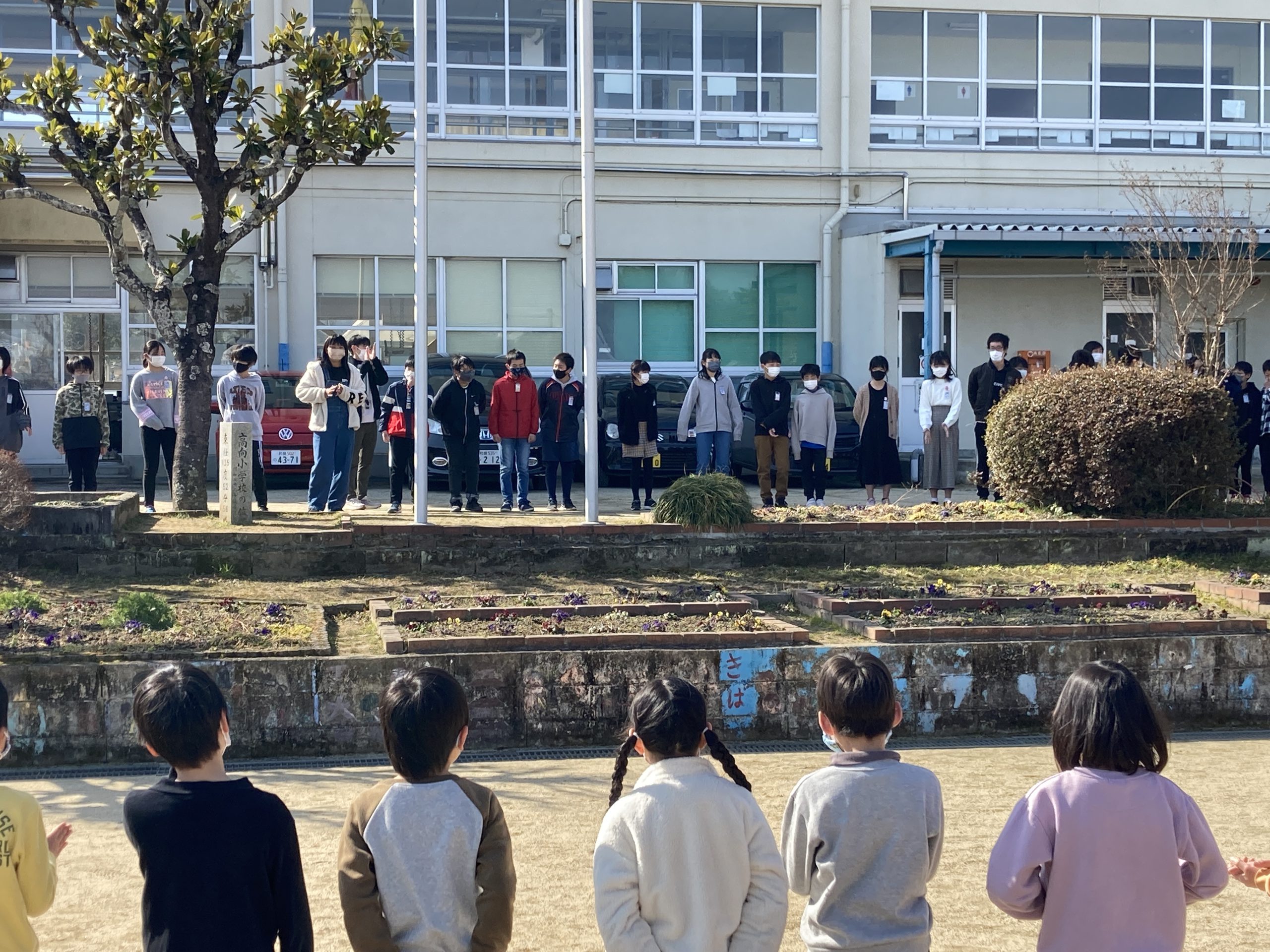 3月に高向小学校を離任された先生方とのお別れの式を行いました。少ない人数の学校なので、子どもたちと先生とのつながりも強く、式の後、職員室に子どもたちが直接話をしようと来てくれていました。