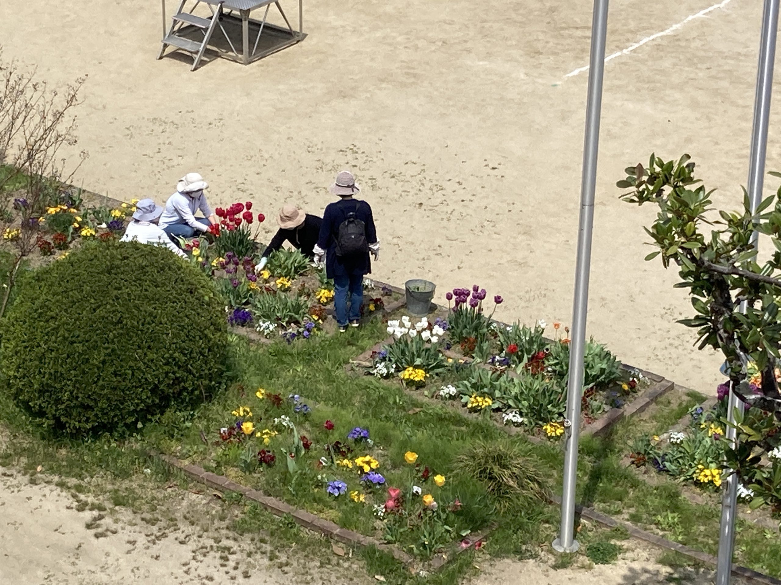 4月から少し活動方法を変えての2回目の活動。本日はお一人新しく活動にご参加いただきました。高向小学校はいつでも花がいっぱいです。花ボランティアさんのおかげでいつも綺麗に保たれており、学校で過ごす子どもたちの癒しとなっています。今日は高いところからですが、活動の様子を撮らせていただきました。