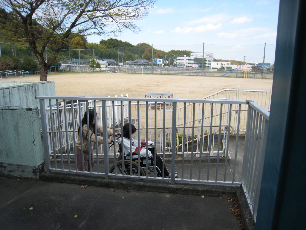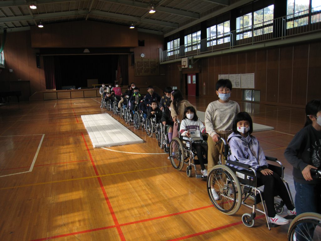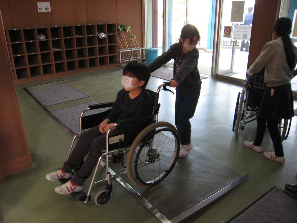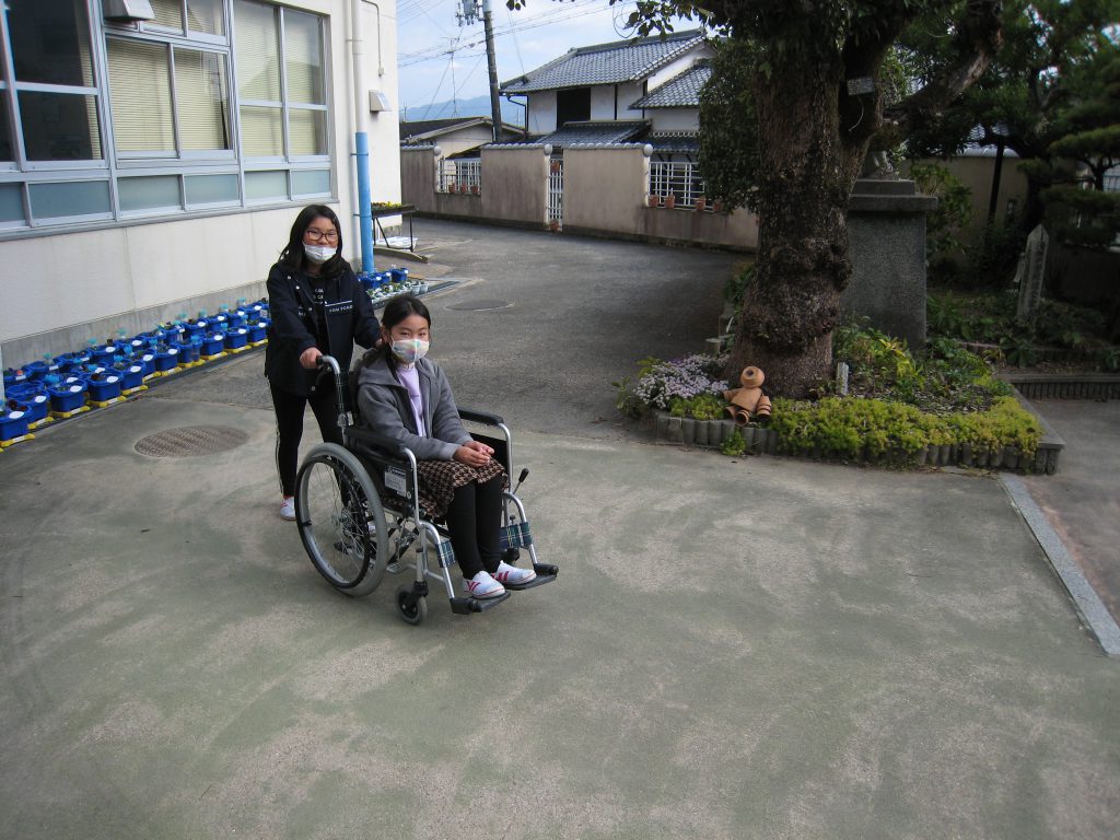前回のアイマスク体験に続き、今回は車椅子体験を行いました。校舎内外を車椅子で回りましたが、少しの段差でも引っかかたり、緩やかなスロープも前向きに下りると乗っている人にとってはとても怖いことが分かりました。この体験を通して、少しでも様々な人の立場に立って考えられるきっかけになればと思います。