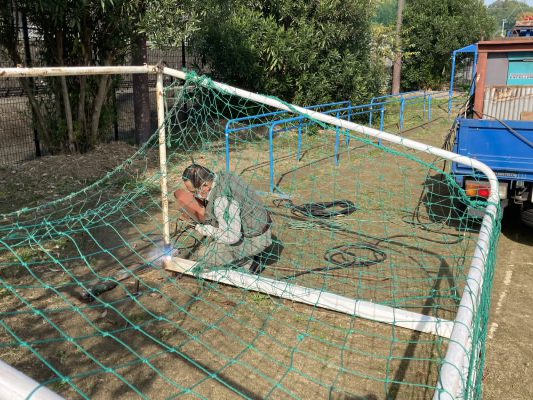 腐食により使用を中止していたサッカーゴール。学校運営協議会委員の垣内さんが本業の技を使い綺麗に修理をしてくださいました。これでまた、大きなゴールでサッカーをすることができますね!