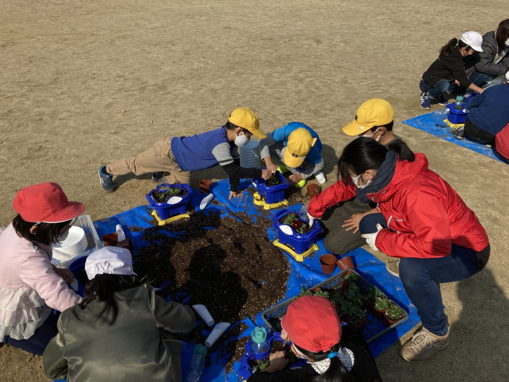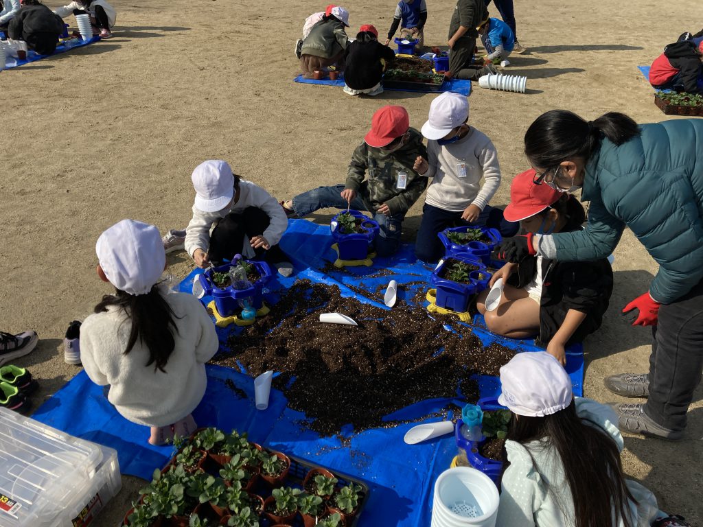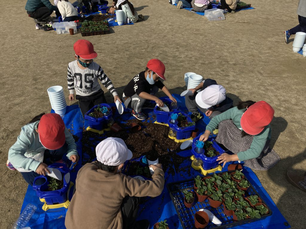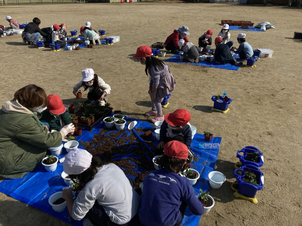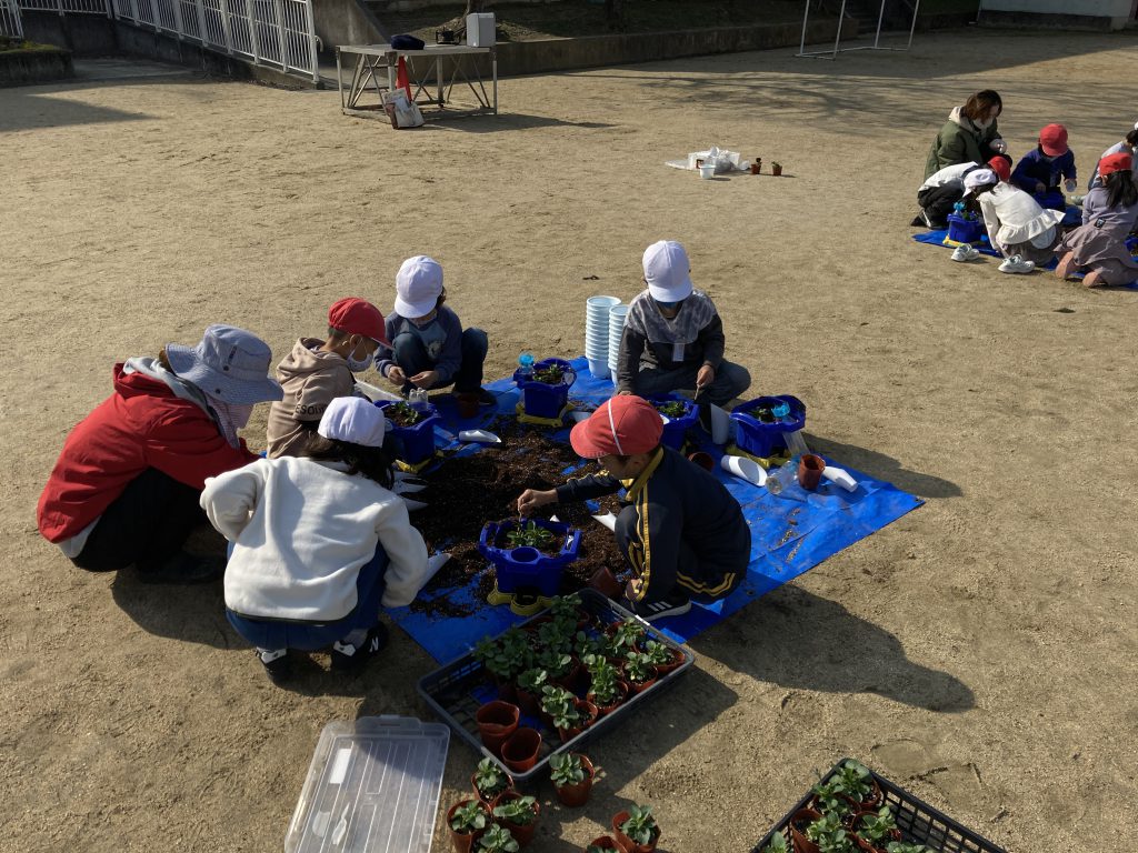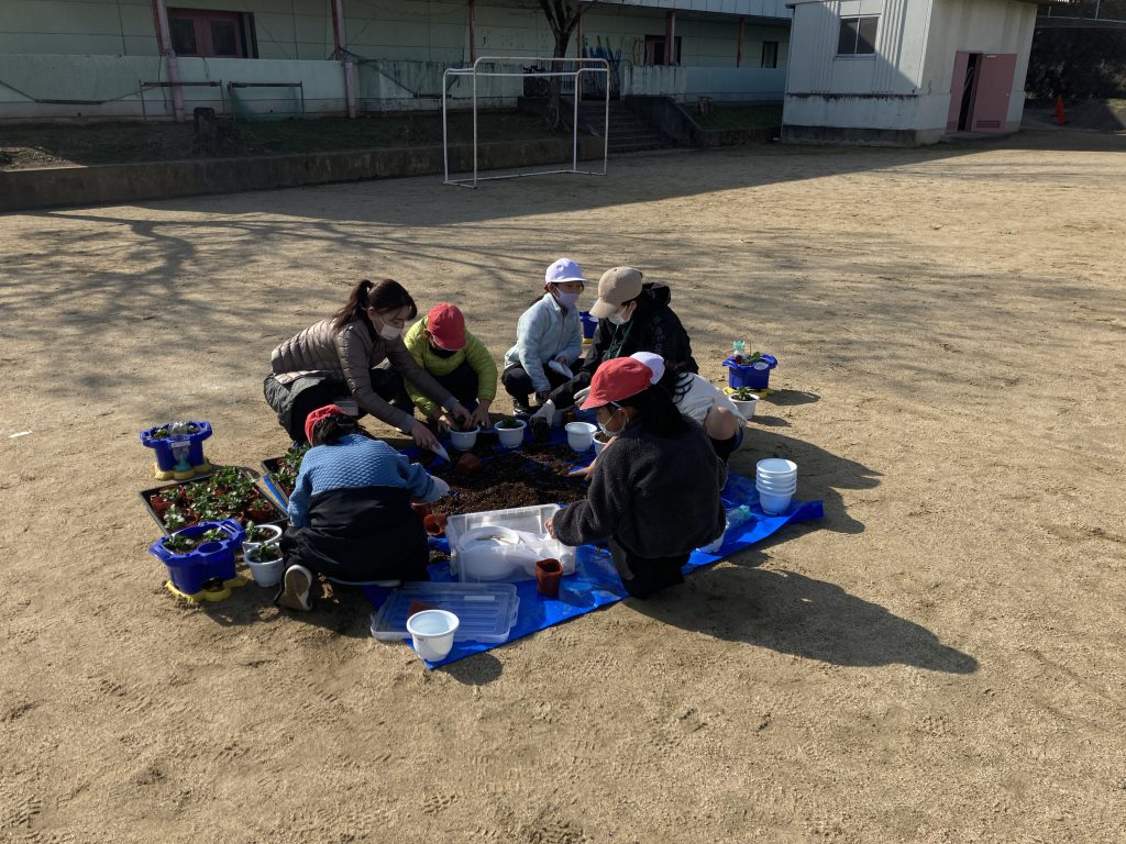 11月25日(木)、先月行った活動から成長した苗を植木鉢に移植する作業を行いました。花ボランティアから4名、12年生保護者の方4名、富田林土木事務所の方2名の計10名の方々にお手伝いいただきました。植木鉢に土を入れ、苗を移植します。全校児童、地域に配る分も作らないといけないので、全部で300株を移植しました。12年生の皆さんよく頑張りました。この後、12年生が1つ1つの植木鉢につけるプレートを手作りします。12月中旬には家庭に持ち帰る予定をしています。