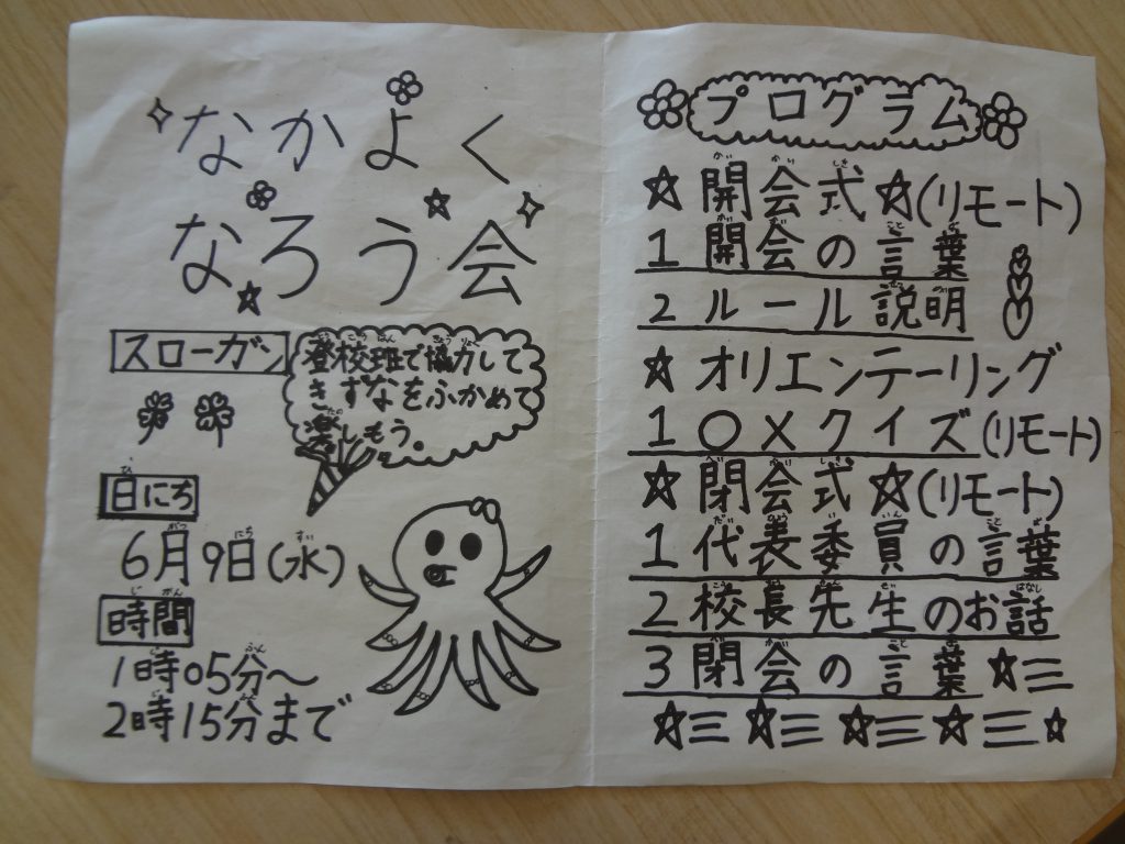 来週行われるなかよくなろう会の事前打ち合わせが行いました。お昼休みを使い、代表委員と登校班の班長さんが集まり、当日の流れや各ブースの説明がされました。制限の多い生活の中でストレスを抱えている人も多いはず。少しでも楽しい時間を過ごしてくれたらと思っています。