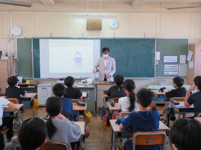 ふるさと学の出前授業としてふるさと文化財課より講師に来ていただきました。5年生の時にはくろまろ君について学習しましたが、今回はその500年後のお話。この授業を導入として、調べ学習を行い、11月に高向地区で開催される市主催の行事「ぐるっとまちじゅう博物館」の子ども解説員を担います。どんな解説員になってくれるのか楽しみですね。