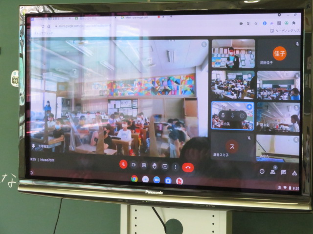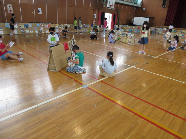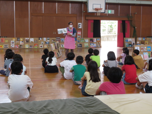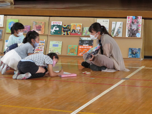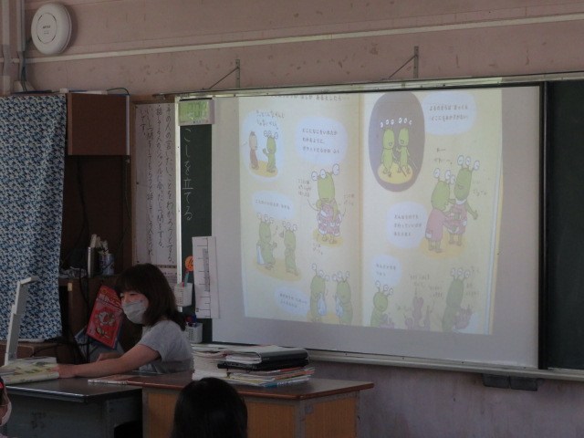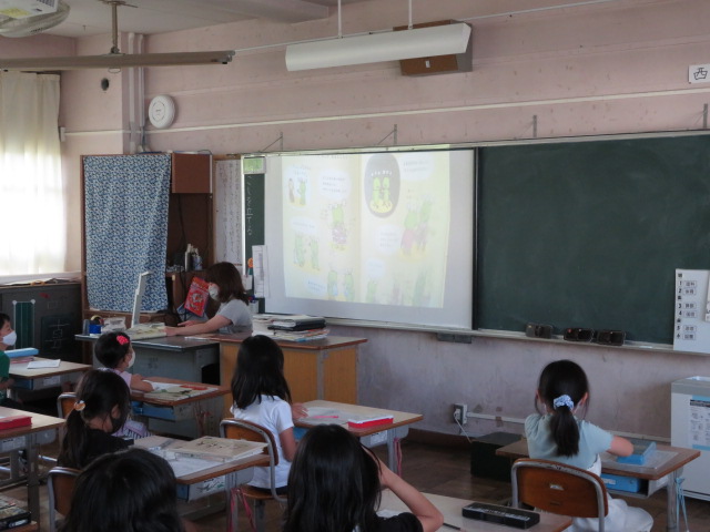 図書の時間が取れる学年では時間の始めに司書さんによる読み聞かせを行っています。昨年度は新型コロナの影響でできませんでしたが、今年は写真のように教室で工夫をして行っています。安全を確保しながら、工夫してできることはできればと思っています。