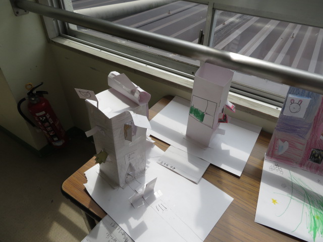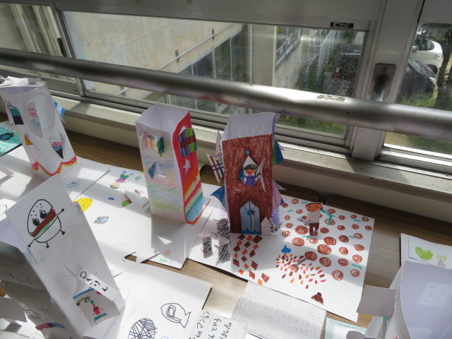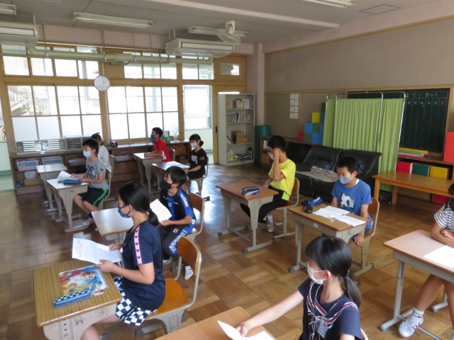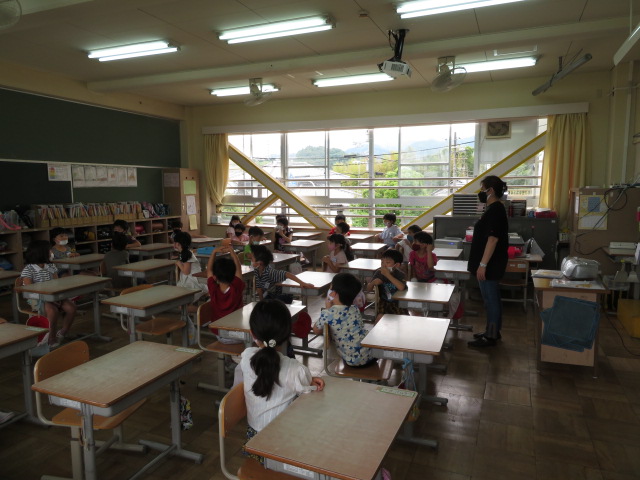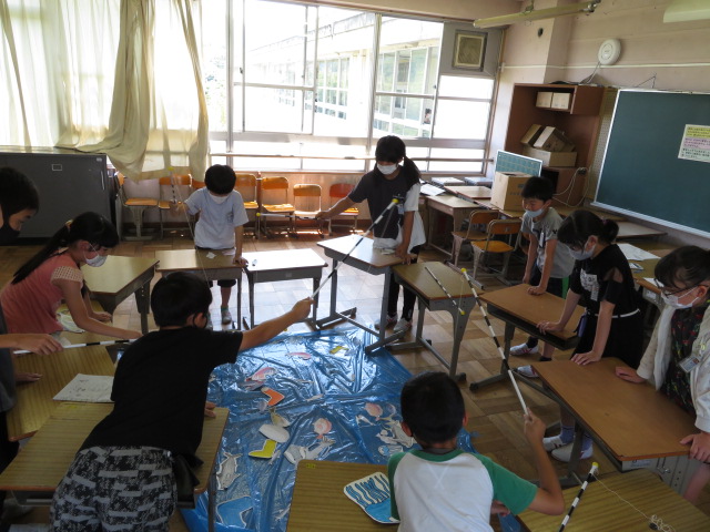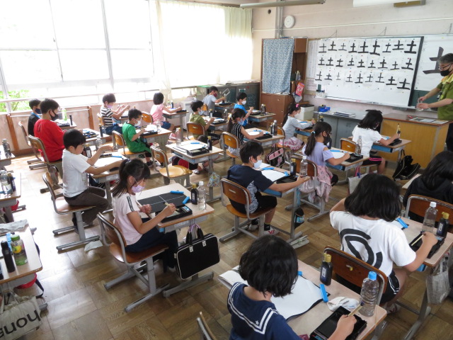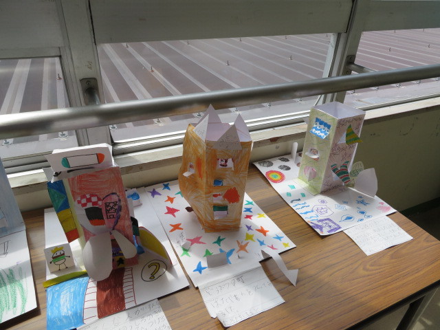午後からは一段と蒸し暑くなっています。子どもたちは汗だくになりながら昼休みを過ごしましたが、5時間目はエアコンの効いた教室で授業を受けています。写真は2年生の図工の作品と3年生の書写の授業風景です。