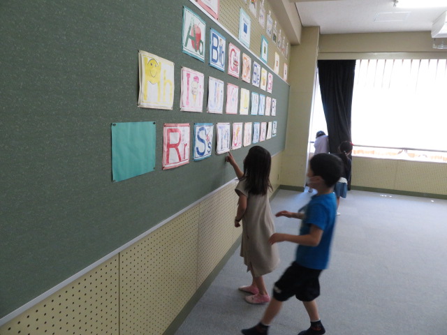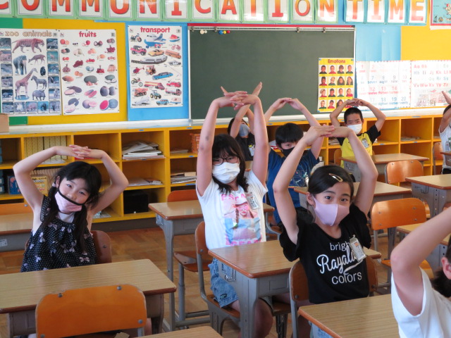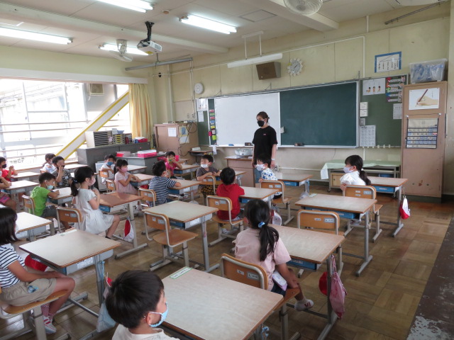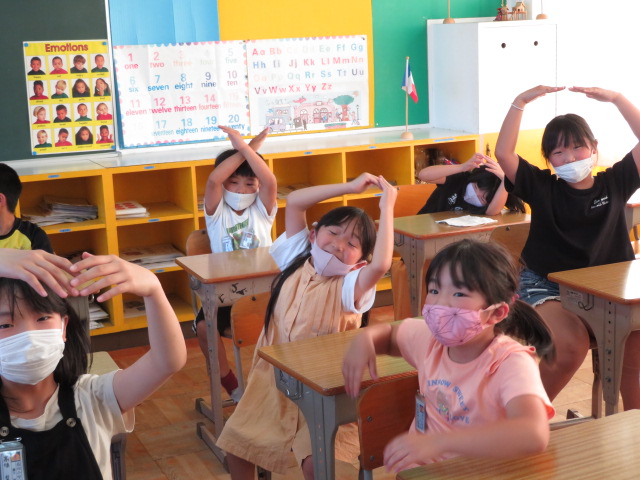 クリスティーナ先生と一緒に英語の授業。今日は「マイネーム イズ~」「ハーワー ユー」など挨拶の練習、歌などとても楽しそうに授業に取り組んでいました。