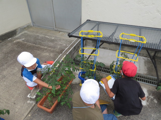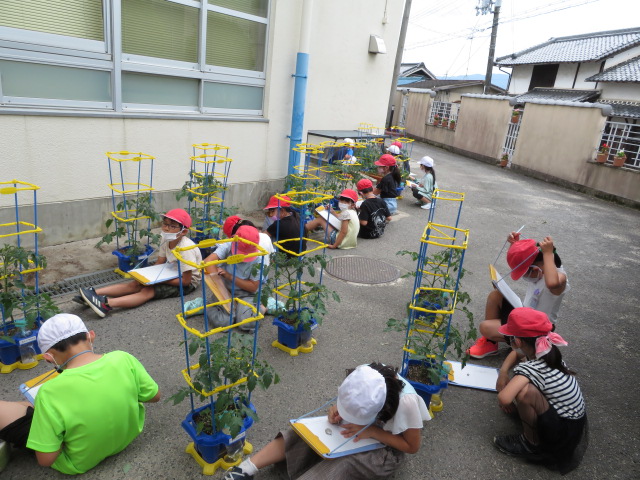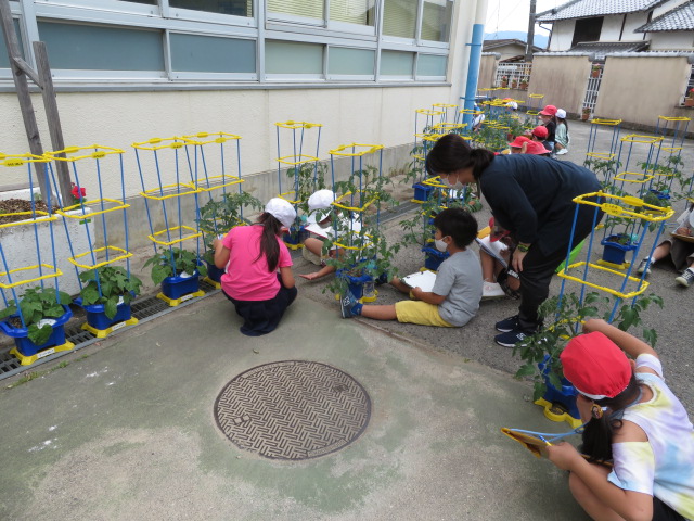 2年生はトマトの観察。日に日に大きくなるトマトに子どもたちも大喜び。手で触ったり、においをかいだりして観察日記を書いていました。