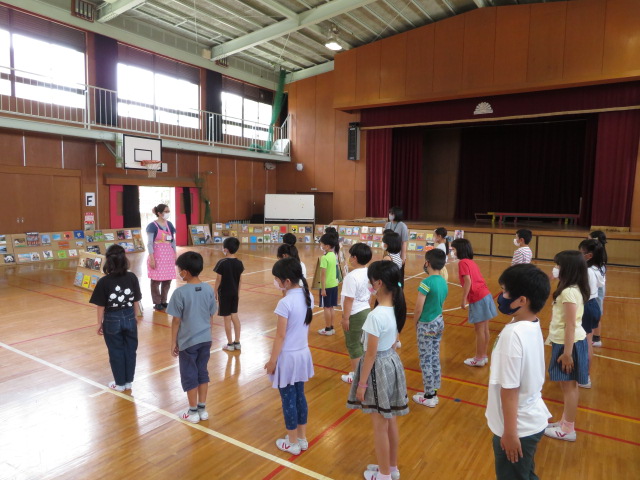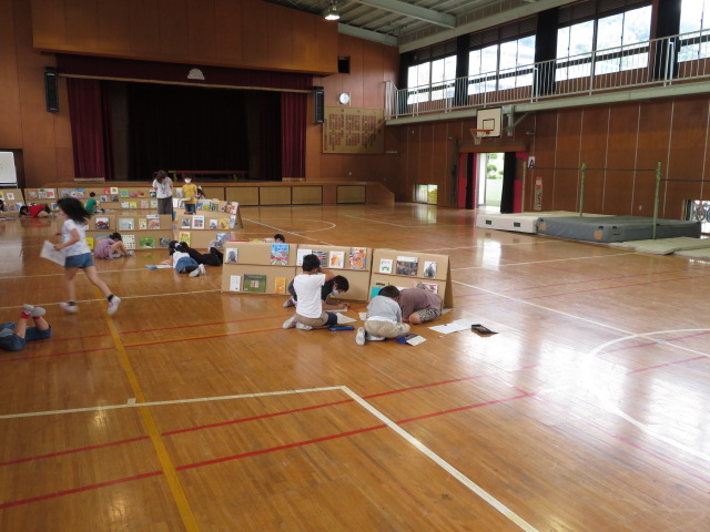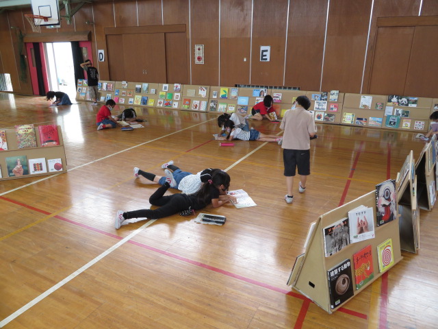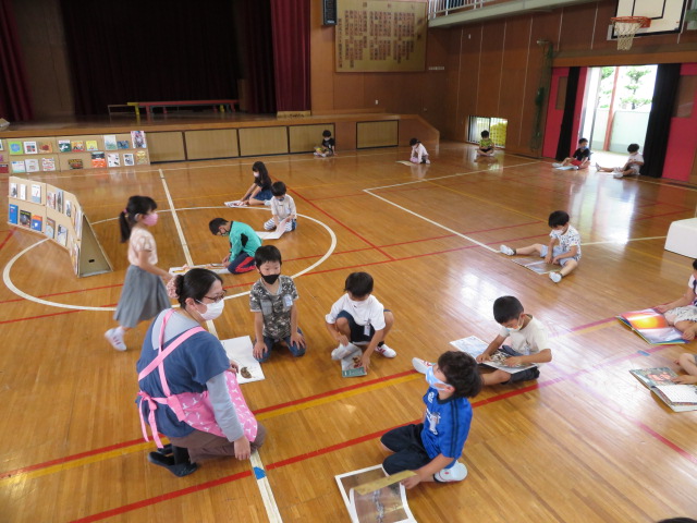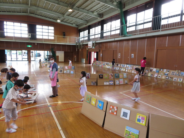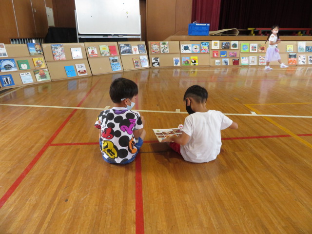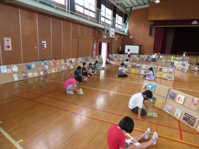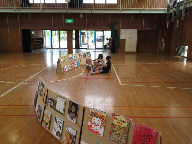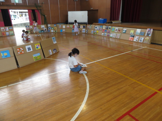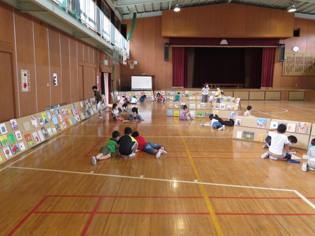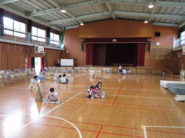 今日はキックス(市立図書館)から本を330冊持って来ていただき、本に親しむ活動「えほんのひろば」を実施しました。いつものような決まりはなく、自由に好きな場所で気になった本を読んでいきます。
