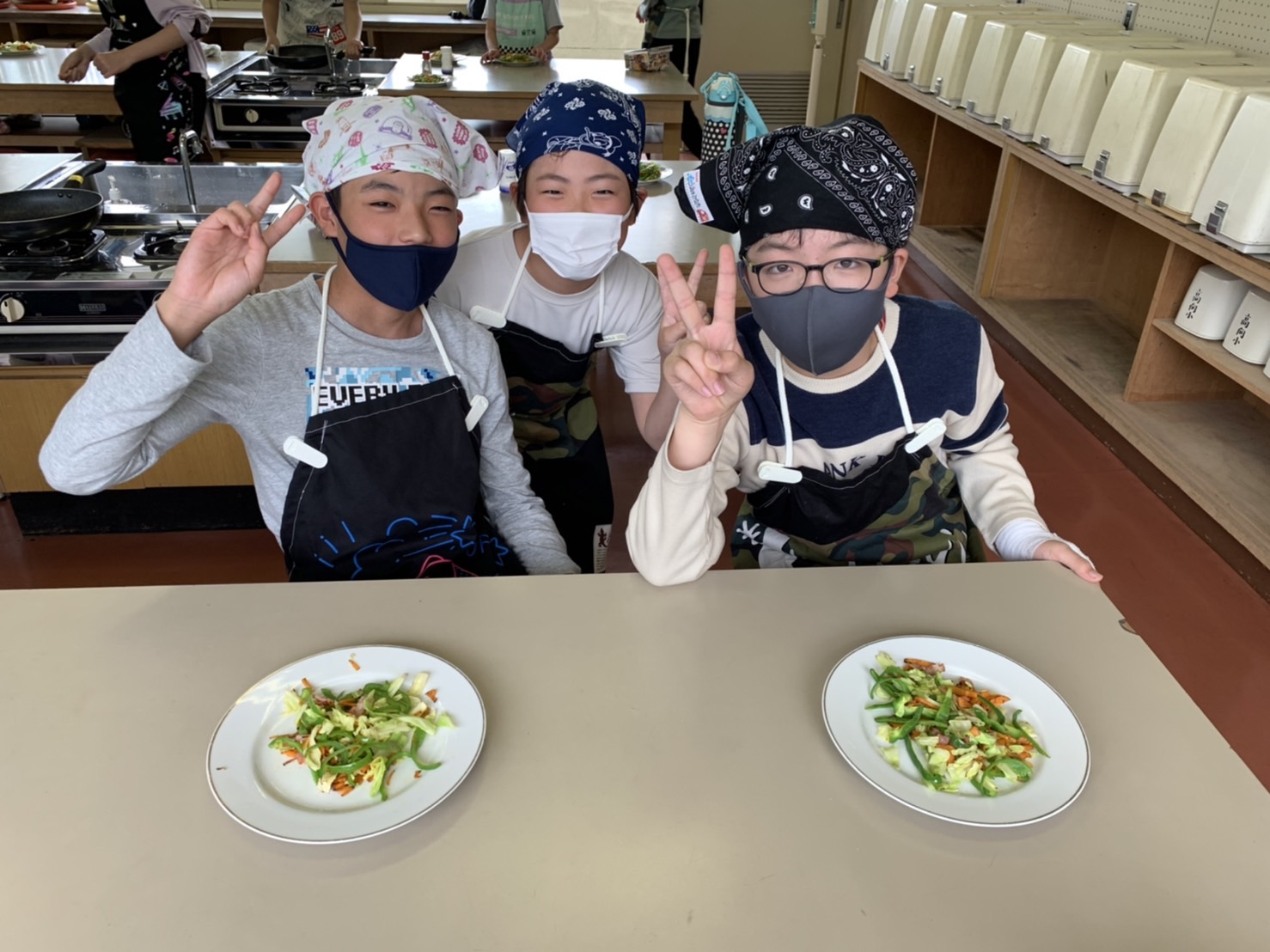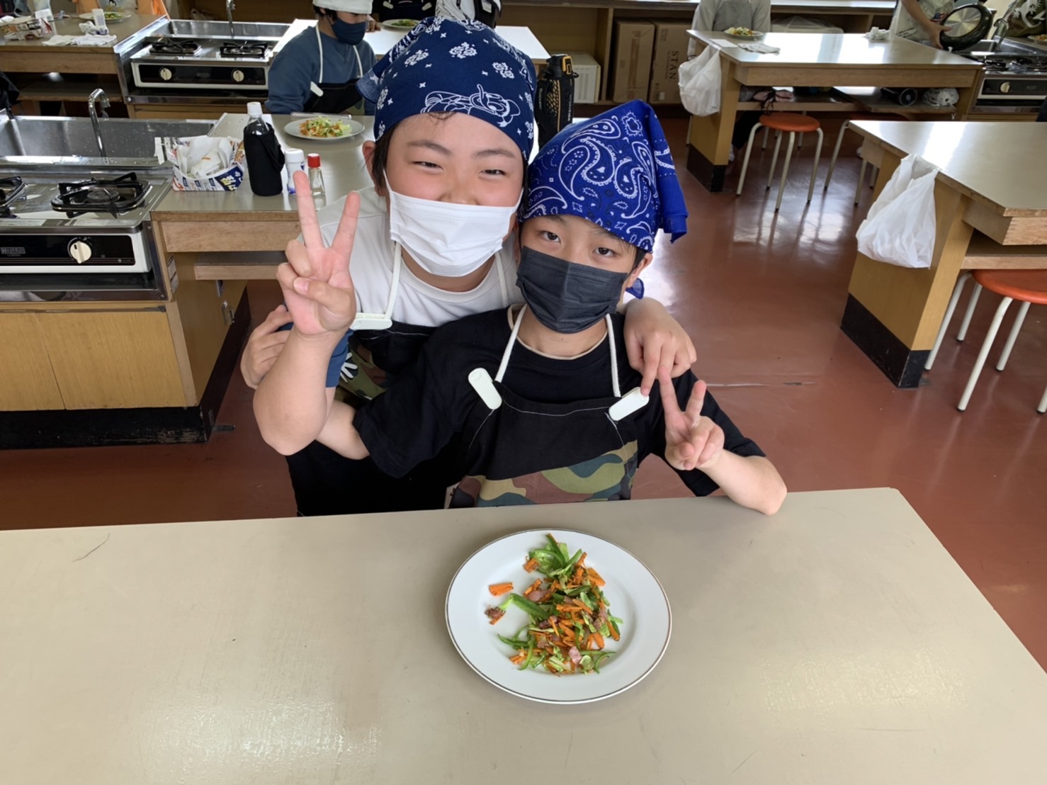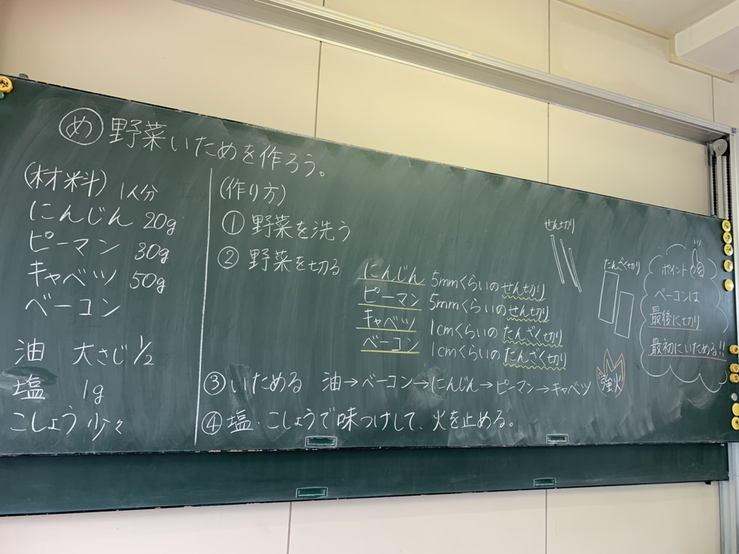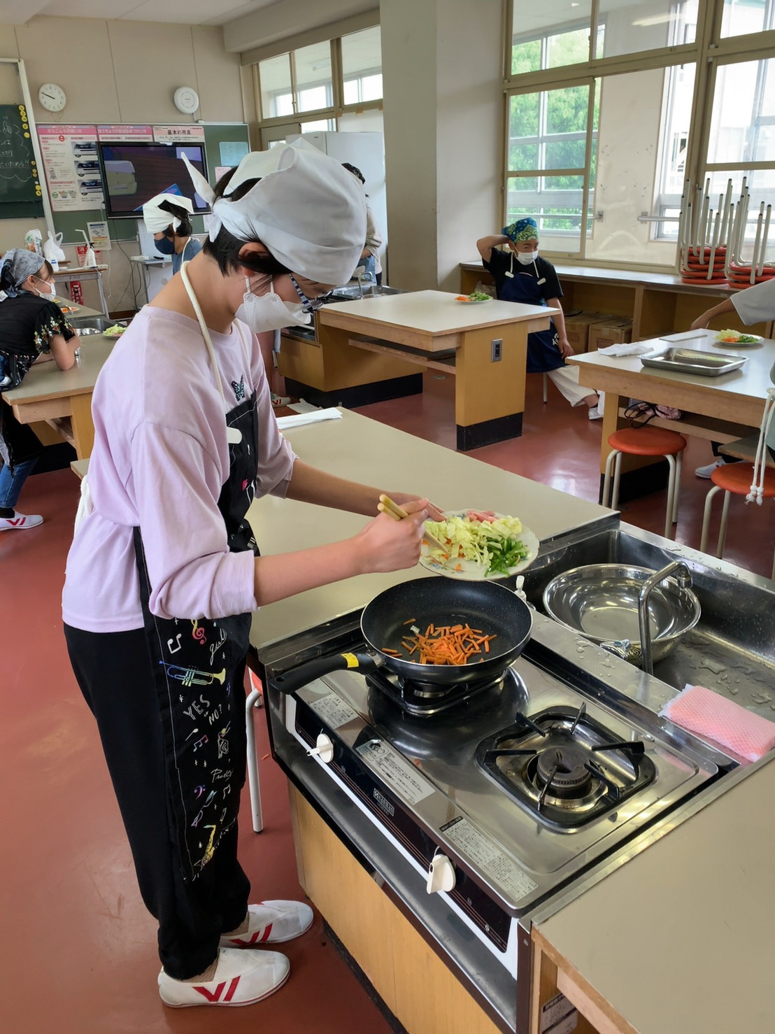 1・2時間目に2回目の調理実習があり、人参・ピーマン・キャベツ・ベーコンで野菜炒めを作りました。