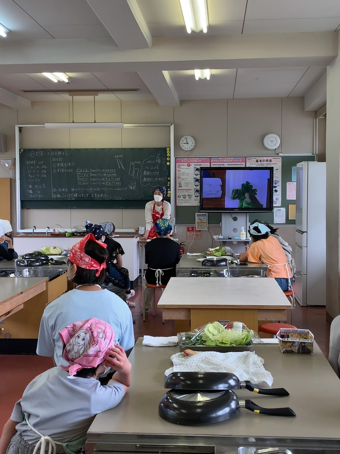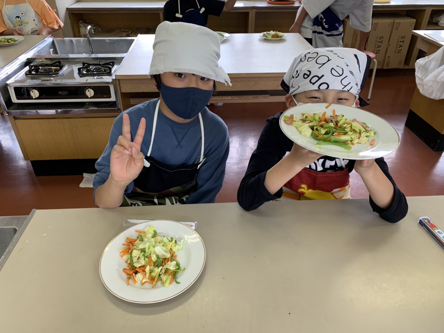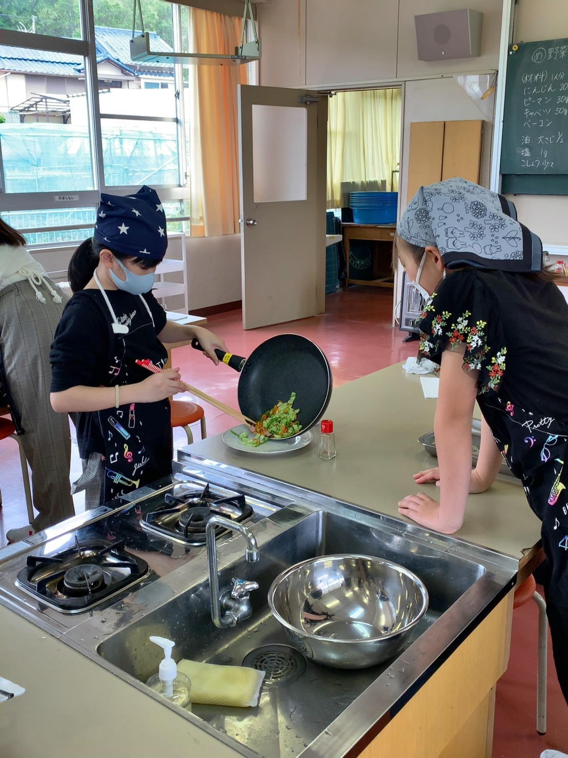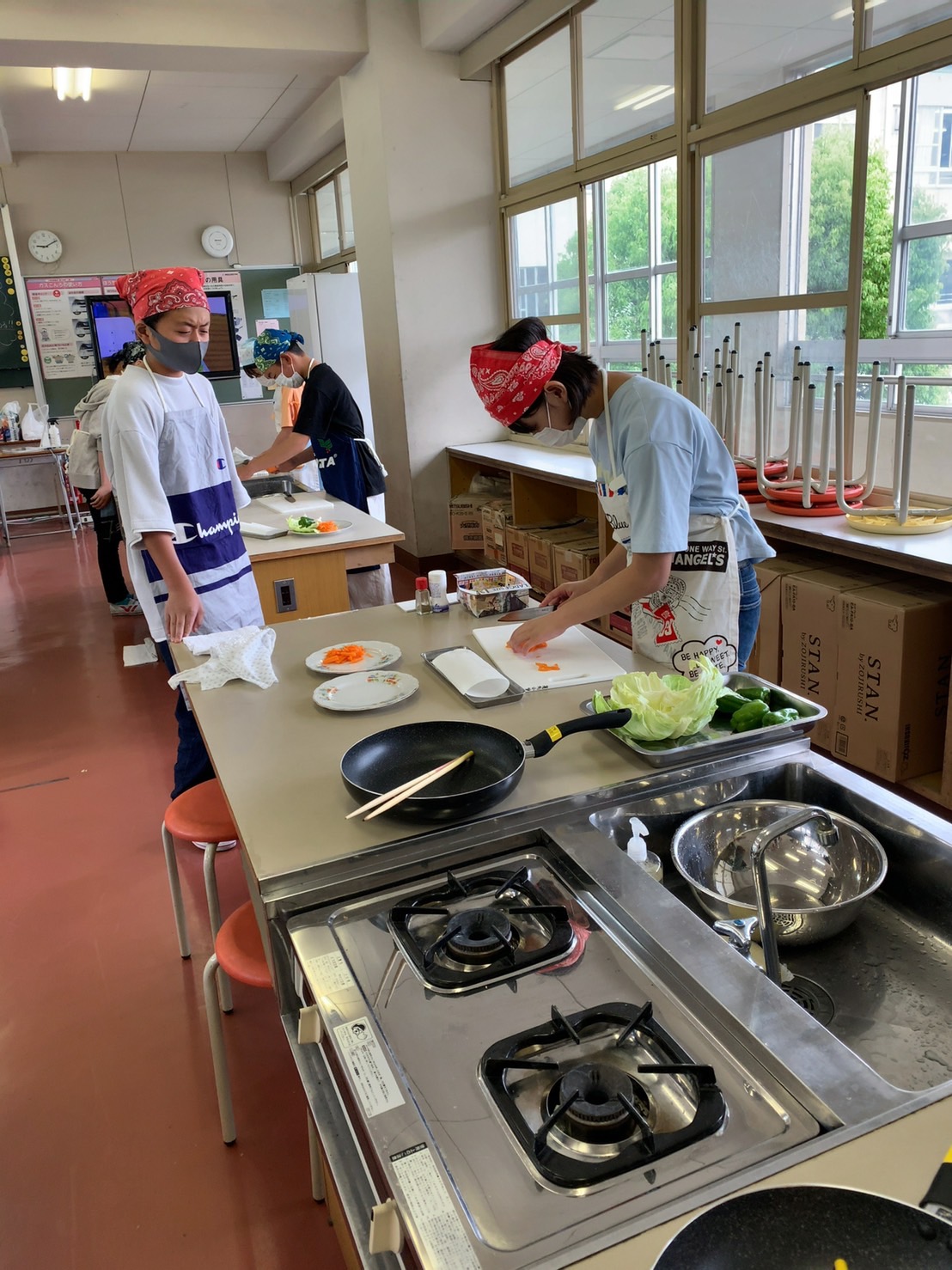 1・2時間目に2回目の調理実習があり、人参・ピーマン・キャベツ・ベーコンで野菜炒めを作りました。