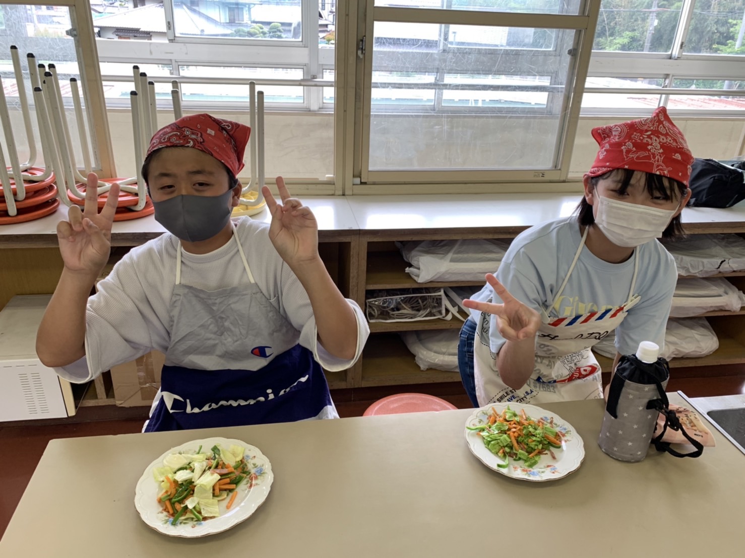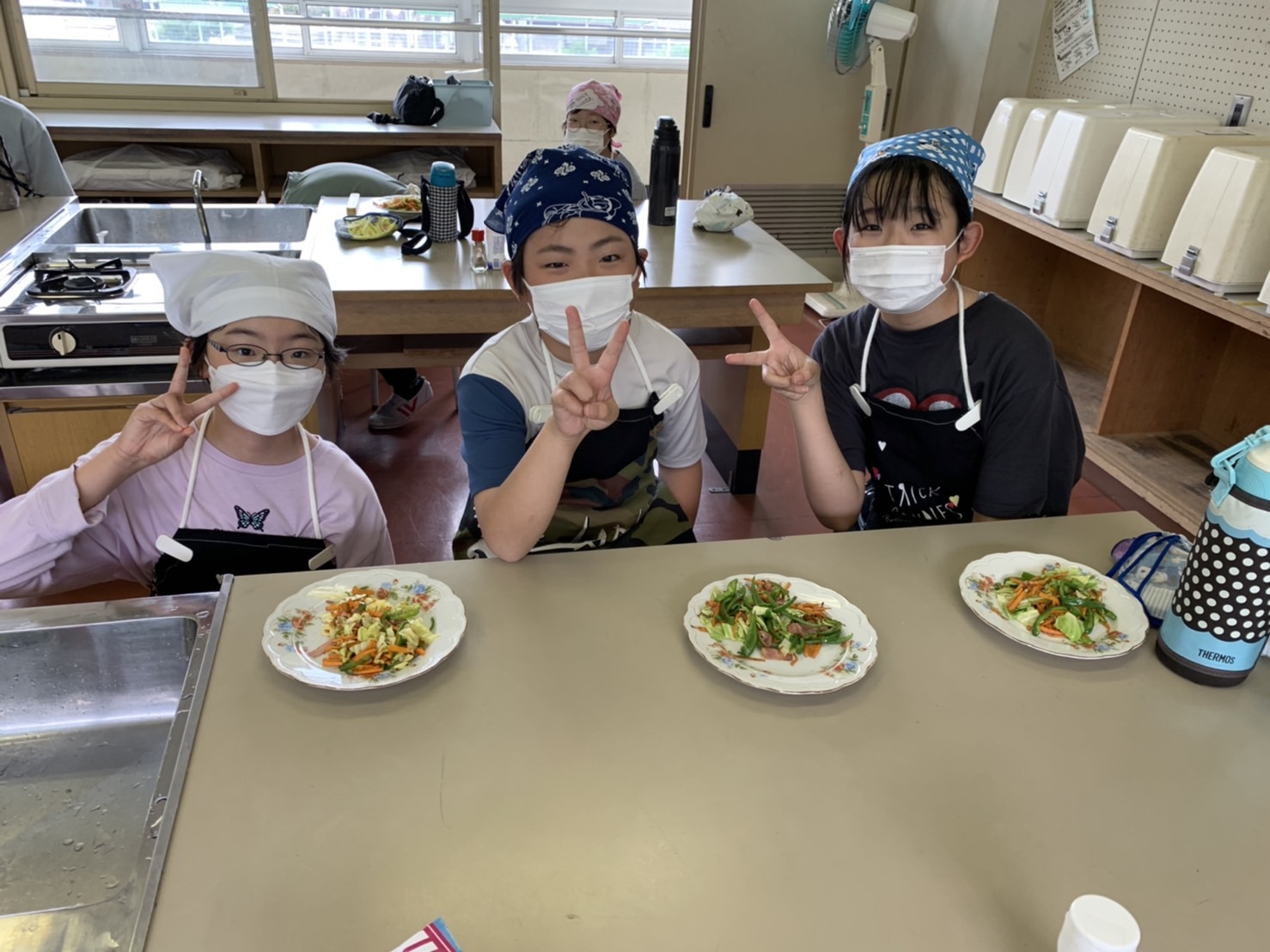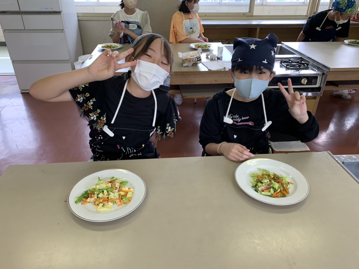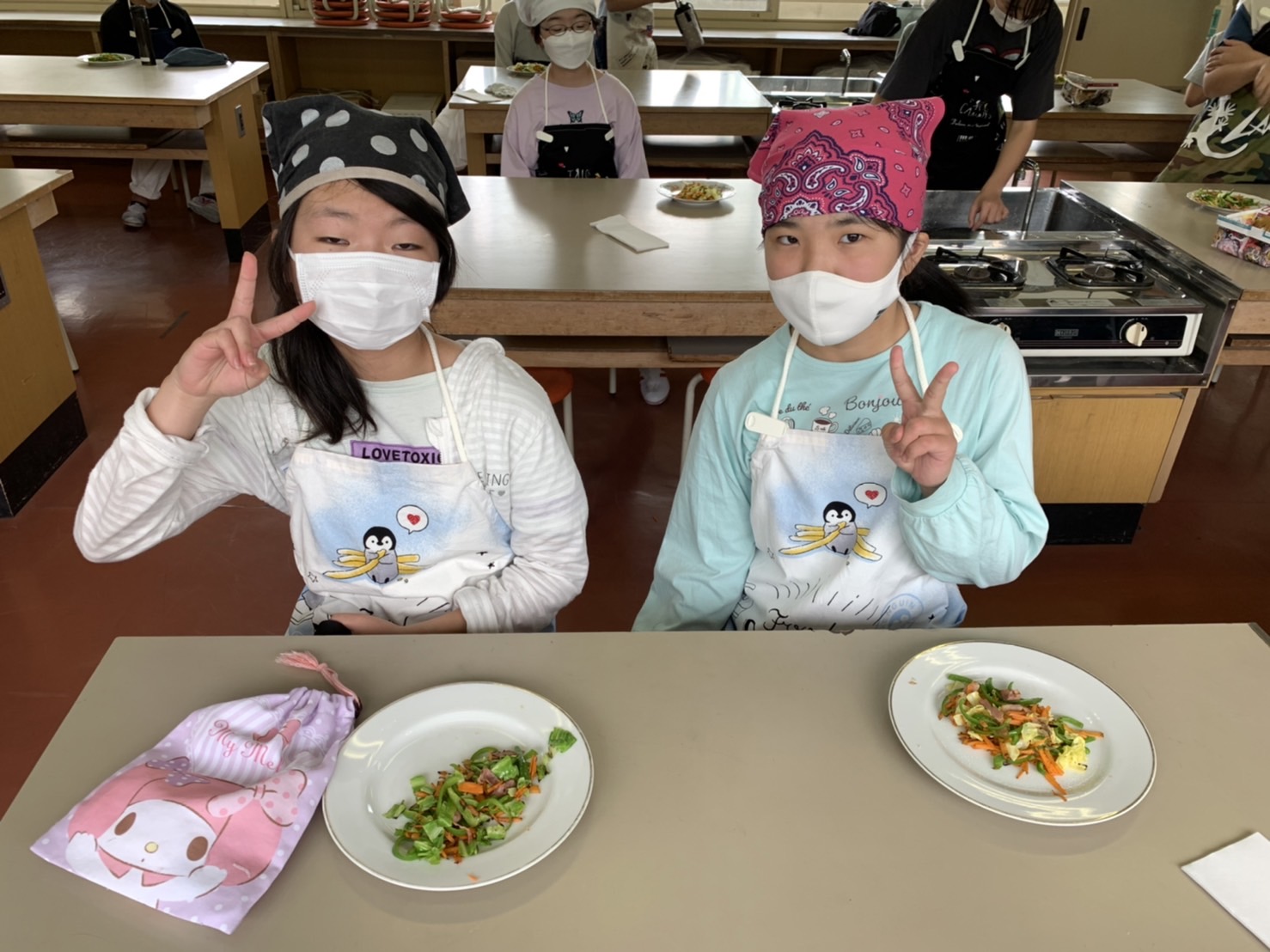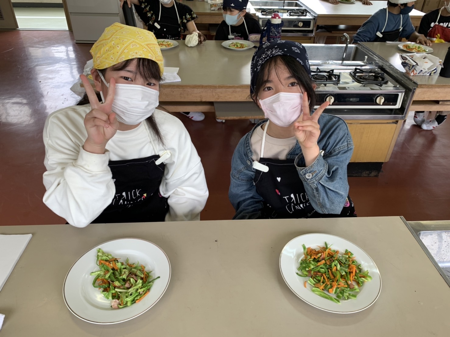 1・2時間目に2回目の調理実習があり、人参・ピーマン・キャベツ・ベーコンで野菜炒めを作りました。
