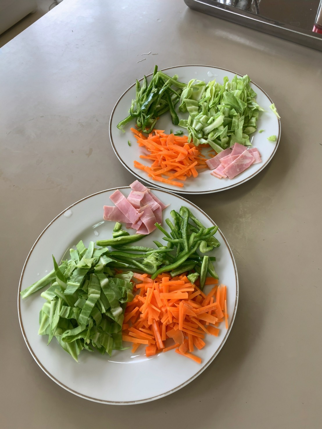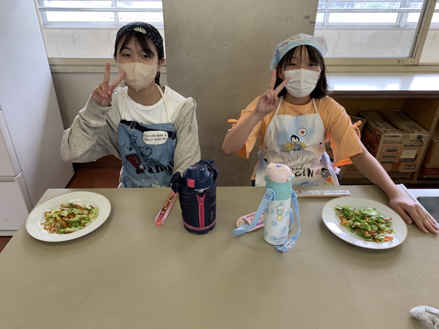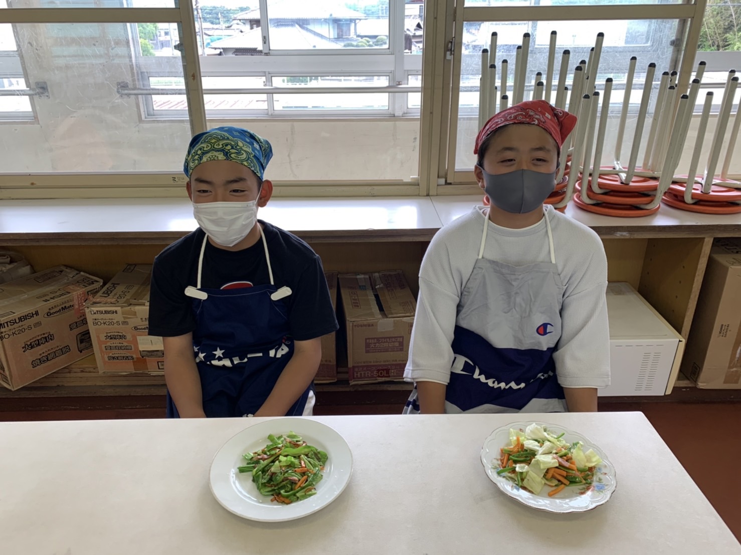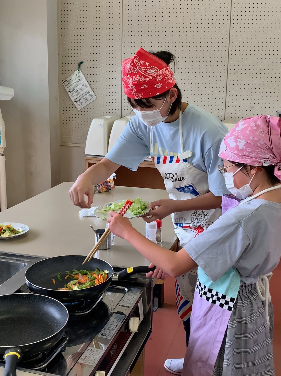 1・2時間目に2回目の調理実習があり、人参・ピーマン・キャベツ・ベーコンで野菜炒めを作りました。