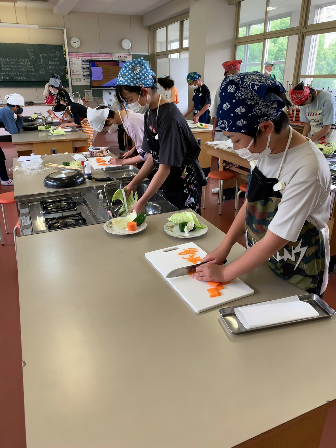 自分で食べる分の野菜を切り、炒めます。授業で学習した「千切り」「短冊切り」の実践です。炒める方は、前回の調理実習の復習ですね。