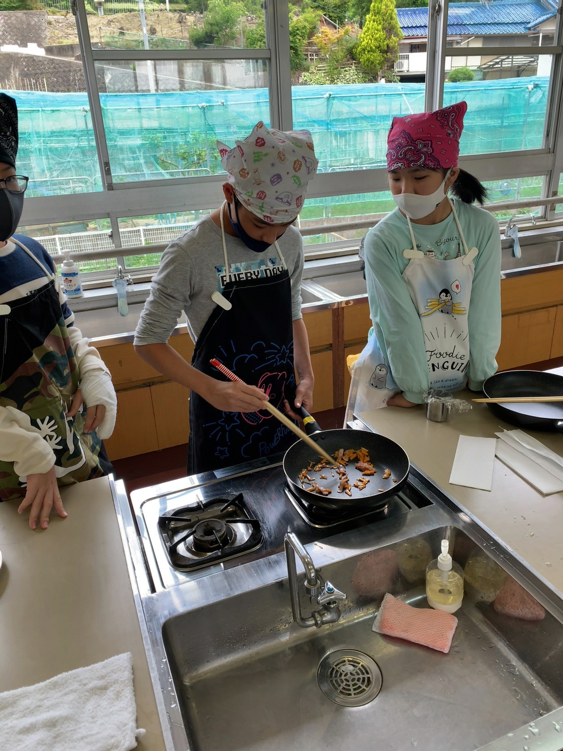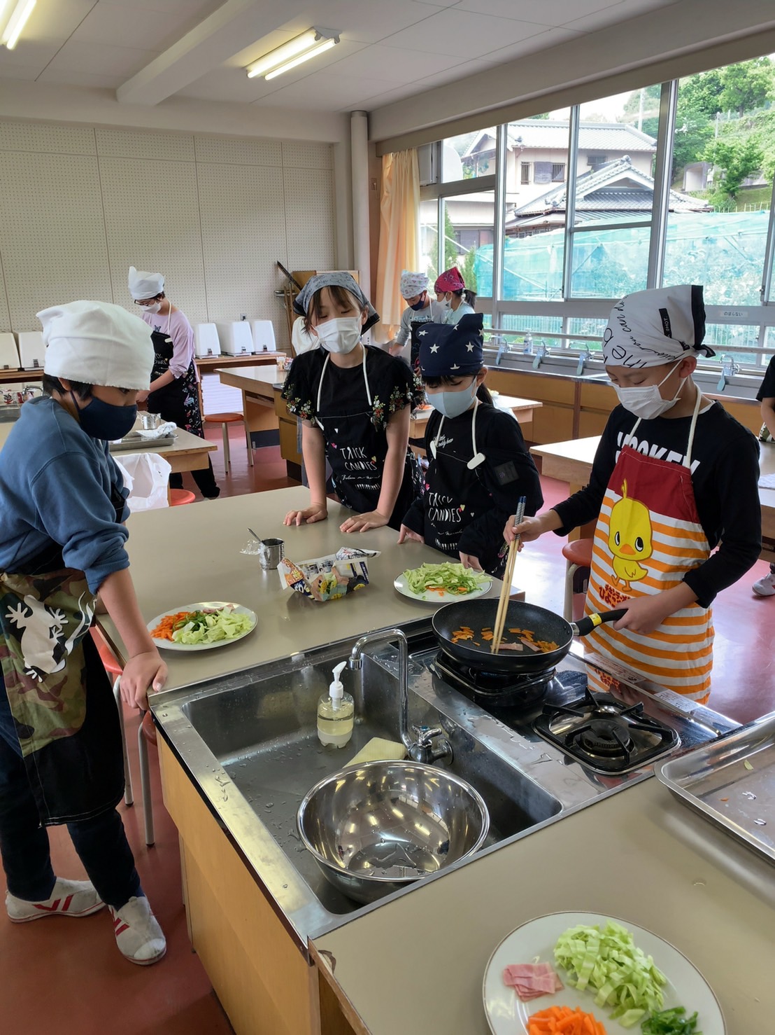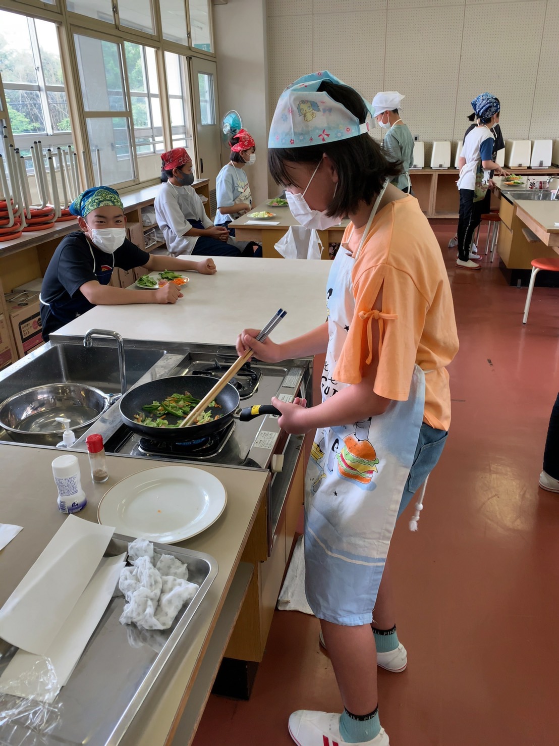 調理実習しながら洗い物をしたり、炒めているお友だちのサポートをしたりと、協力し合って作業していました。さすが6年生です。