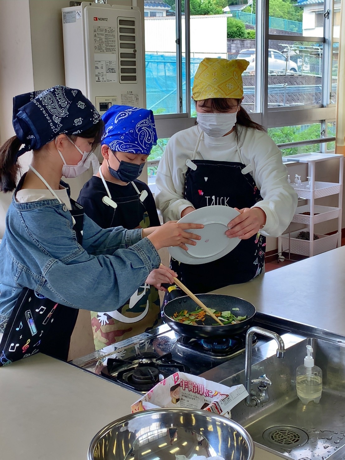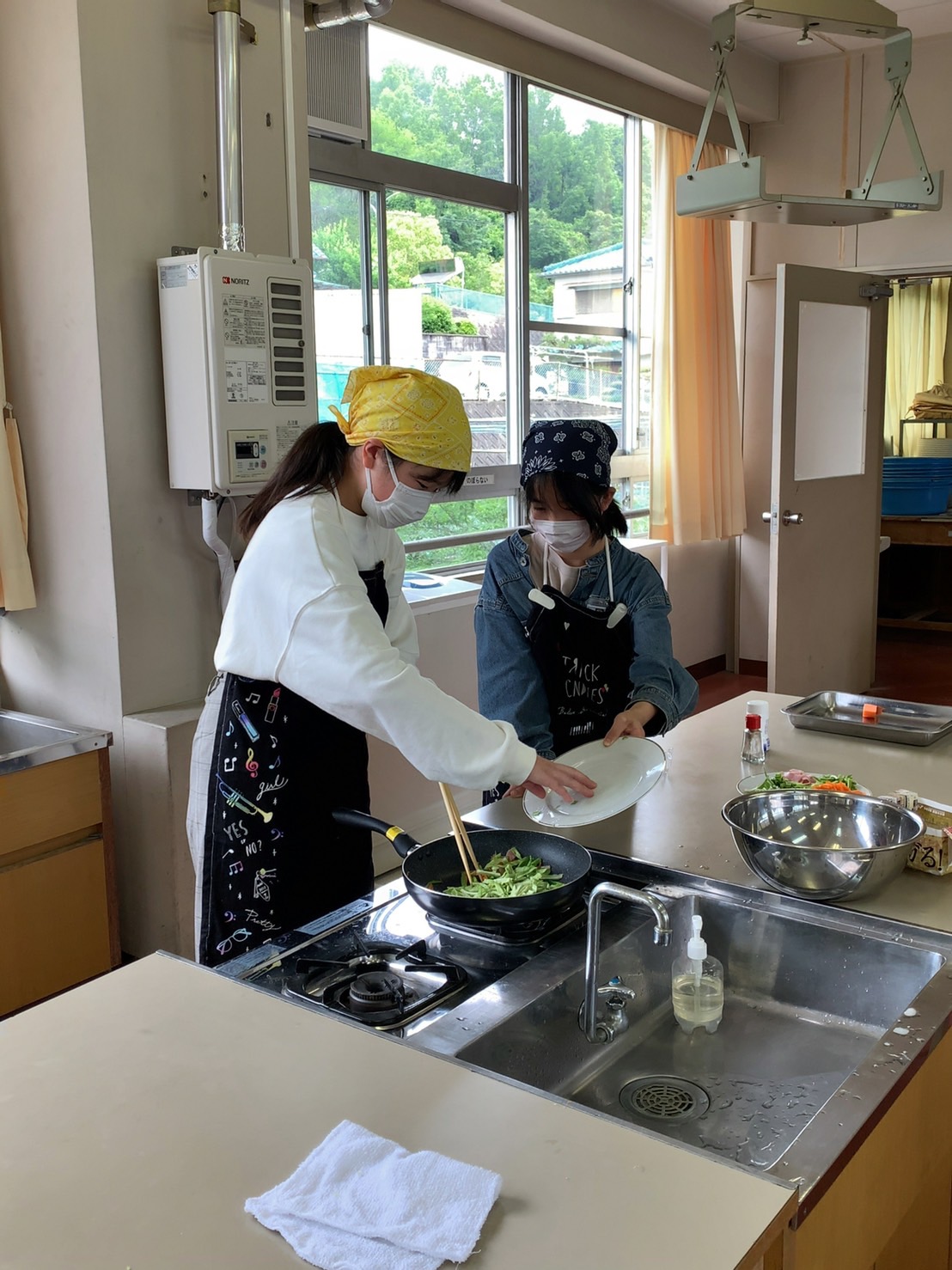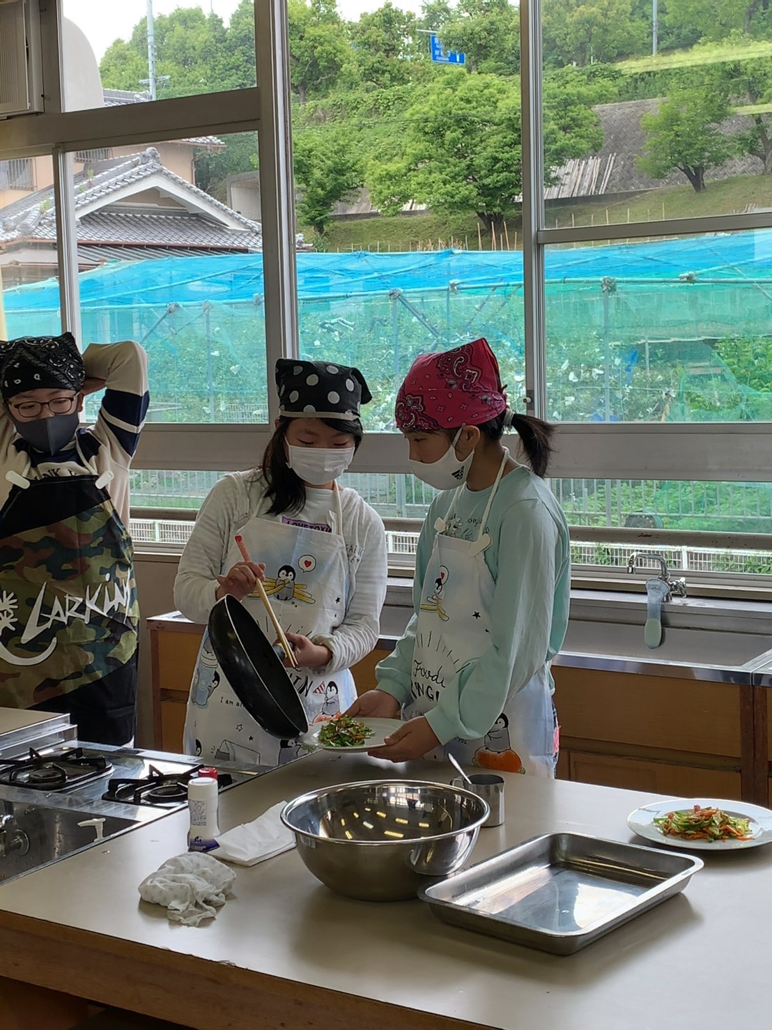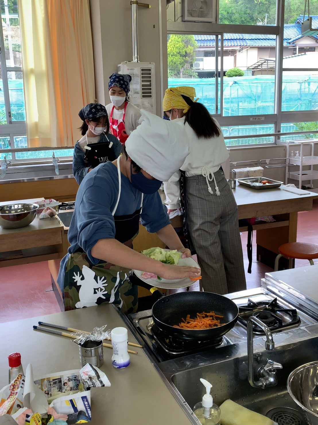 調理実習しながら洗い物をしたり、炒めているお友だちのサポートをしたりと、協力し合って作業していました。さすが6年生です。
