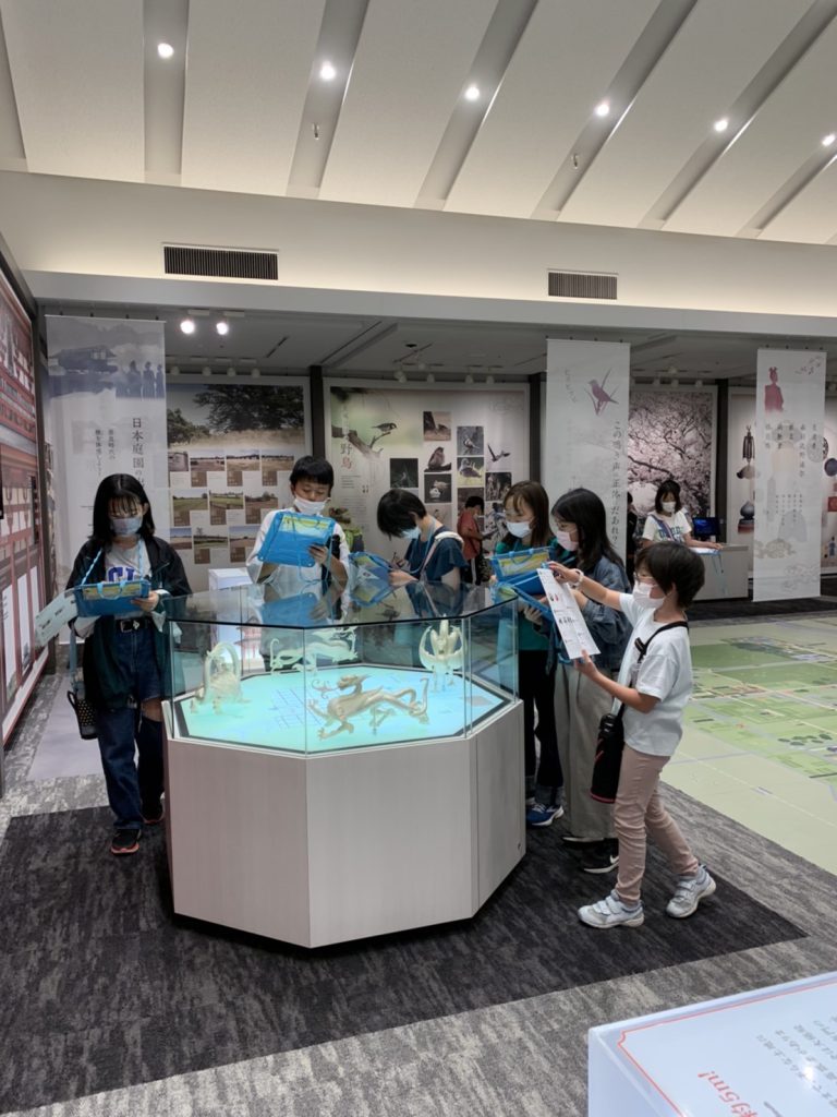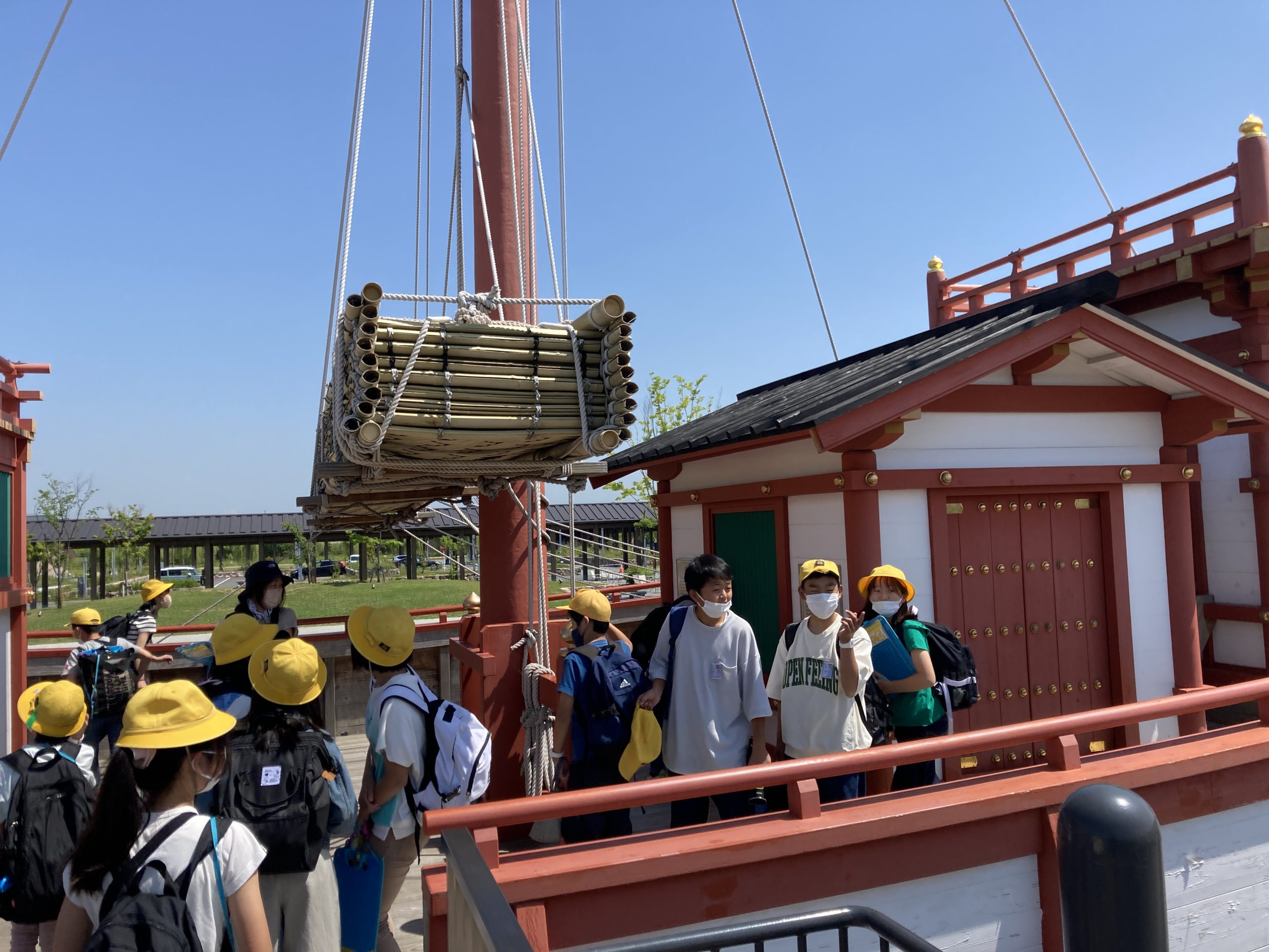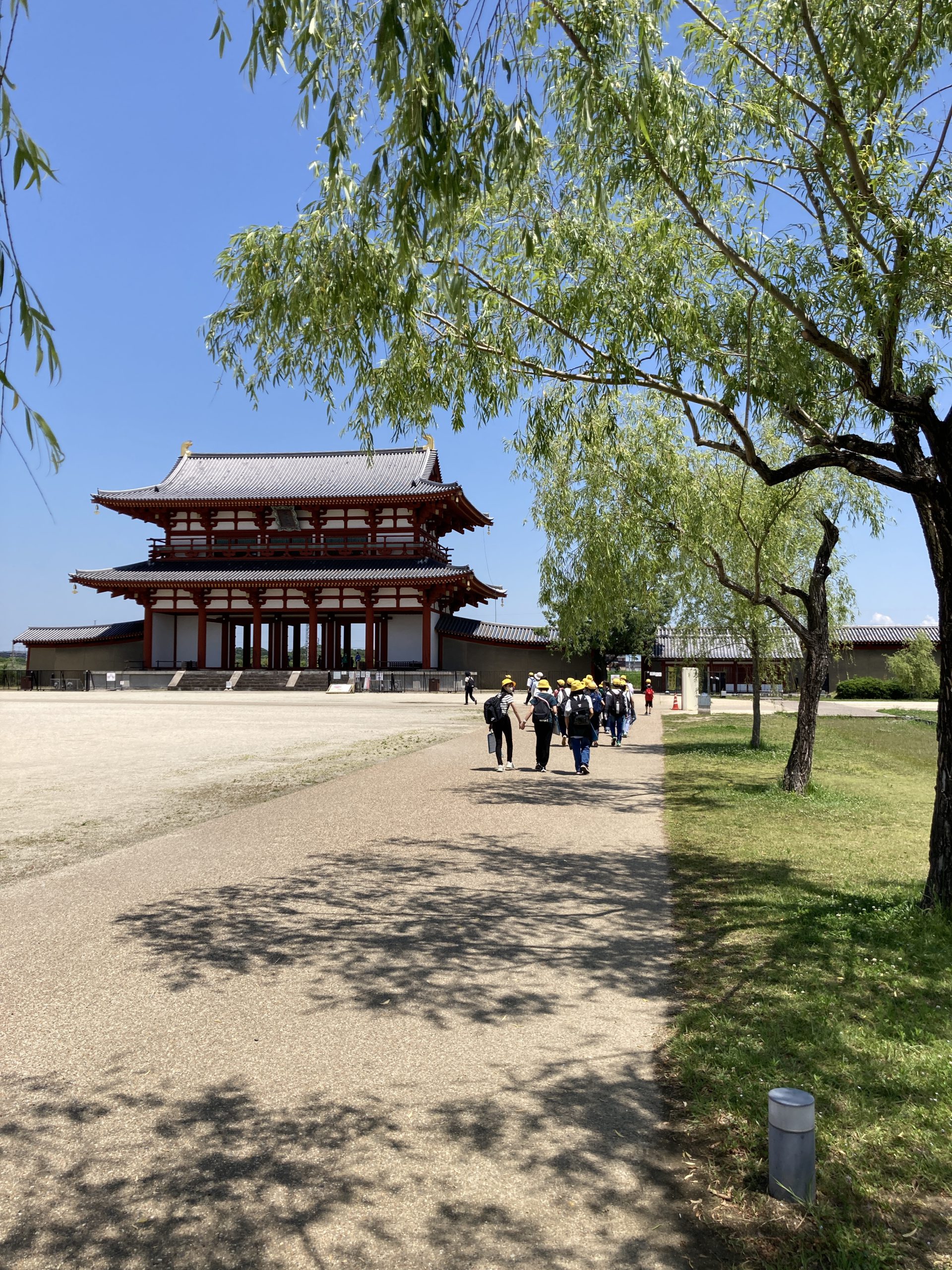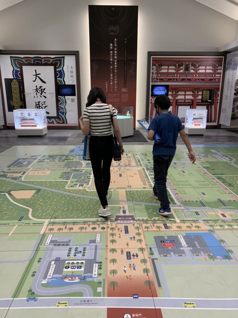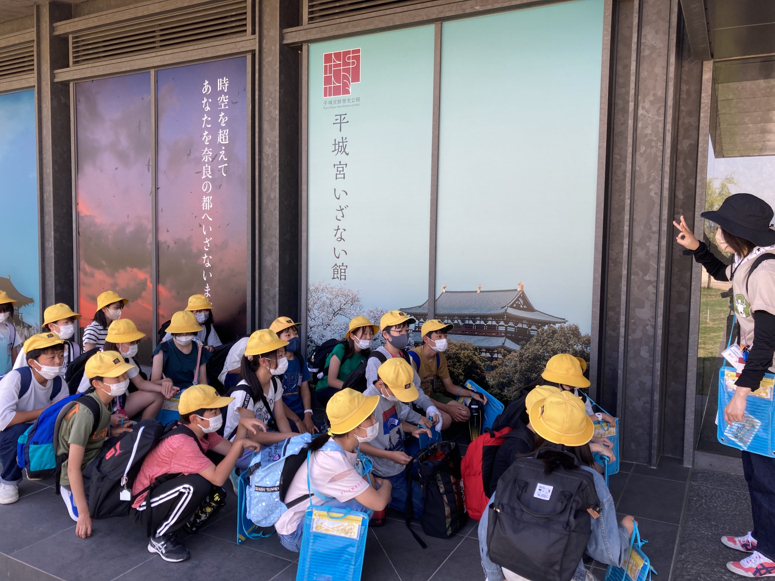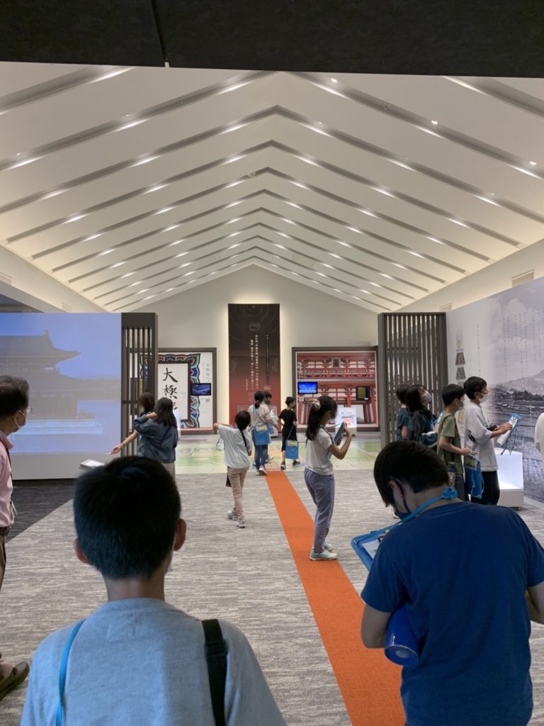 1つ目の活動場所の平城宮跡に到着し集合写真を撮影後、平城宮いざない館にてオリエンテーリングをします。教科書に出てくるようなものなどを見ることができます。