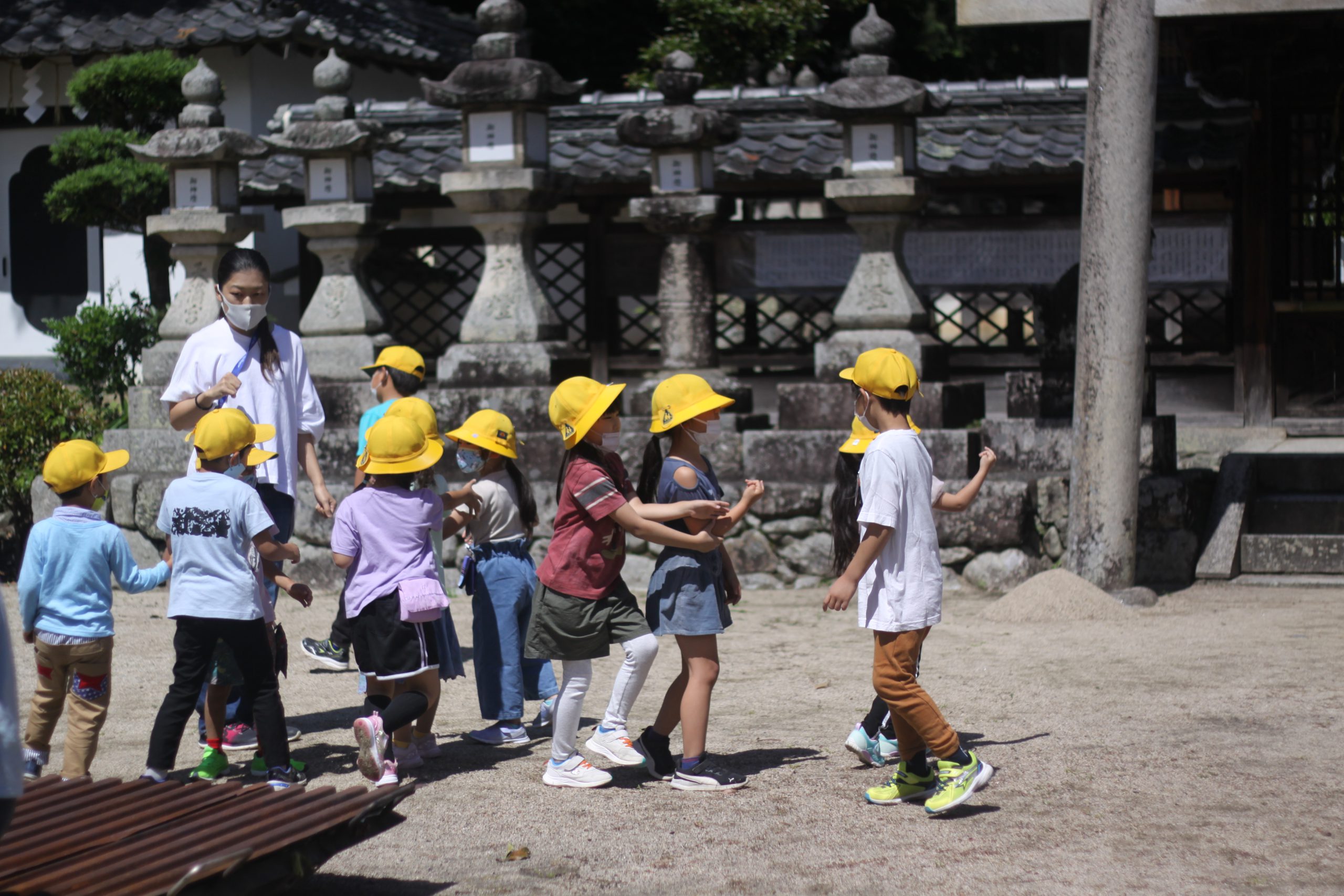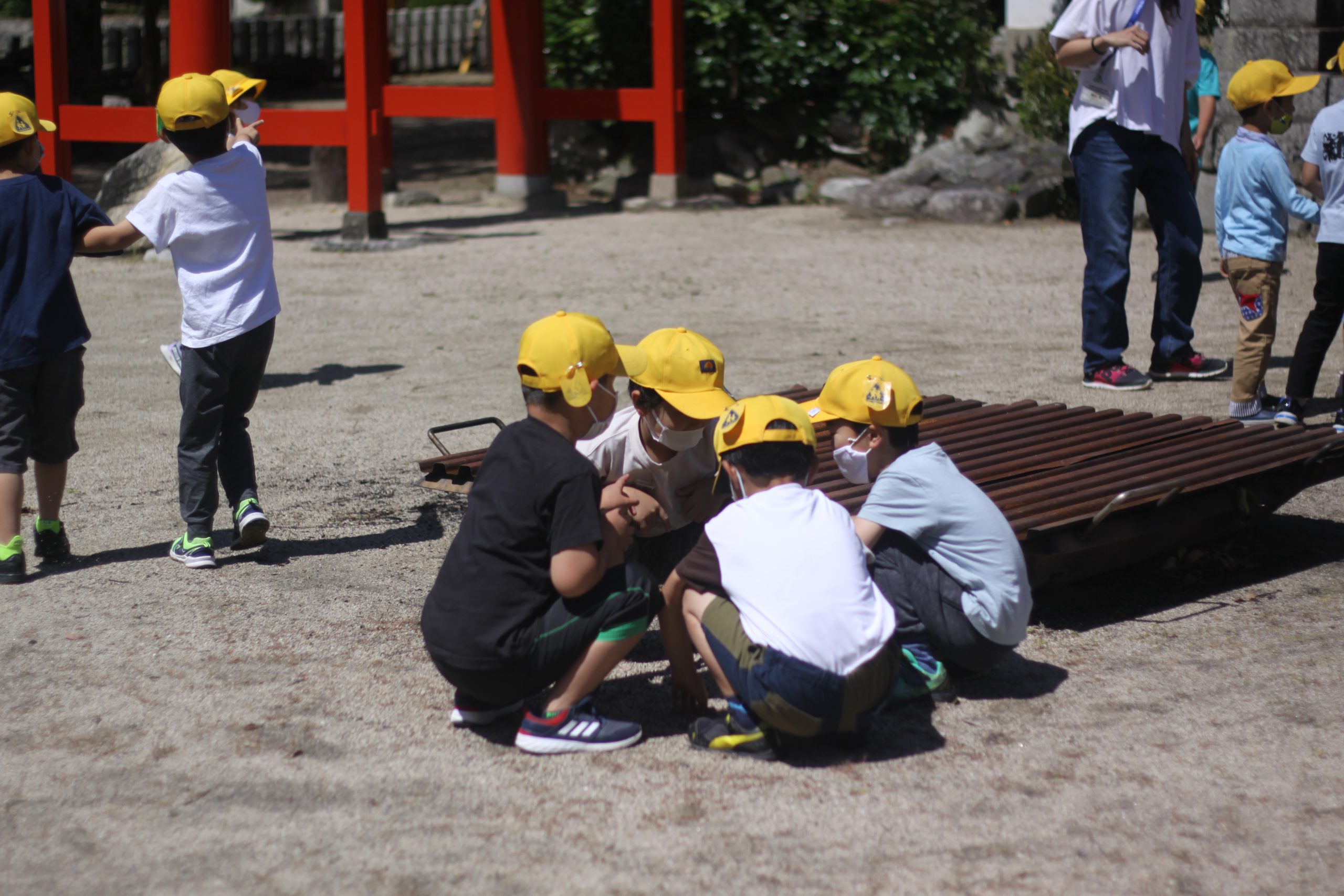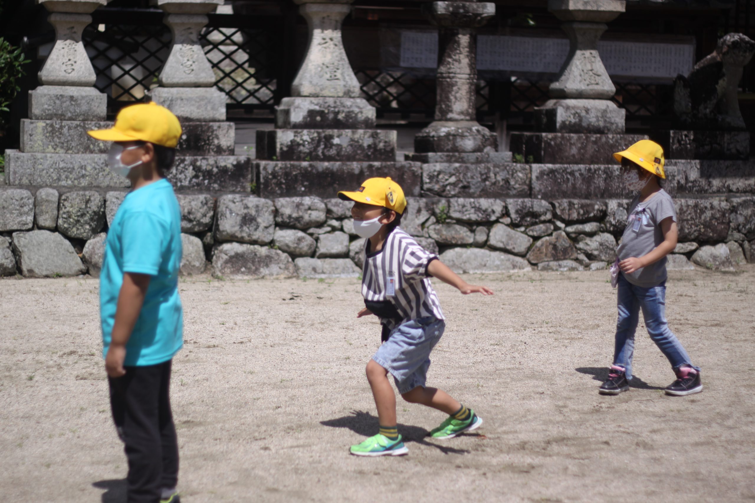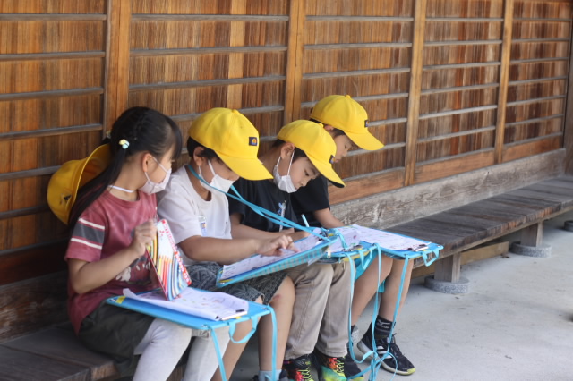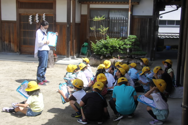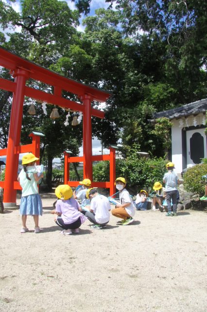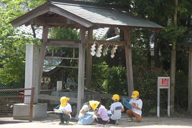 校区にある高向神社。今日は1年生が高向神社までお散歩をして、高向神社の中をプチ探検しました。「ふわふわ、ぷちぷち、つるつるなど」するものをグループで探し回りました。探検の前には「猛獣狩り」「だるまさんがころんだ」などみんな遊びもしました。とても楽しい時間になりました。