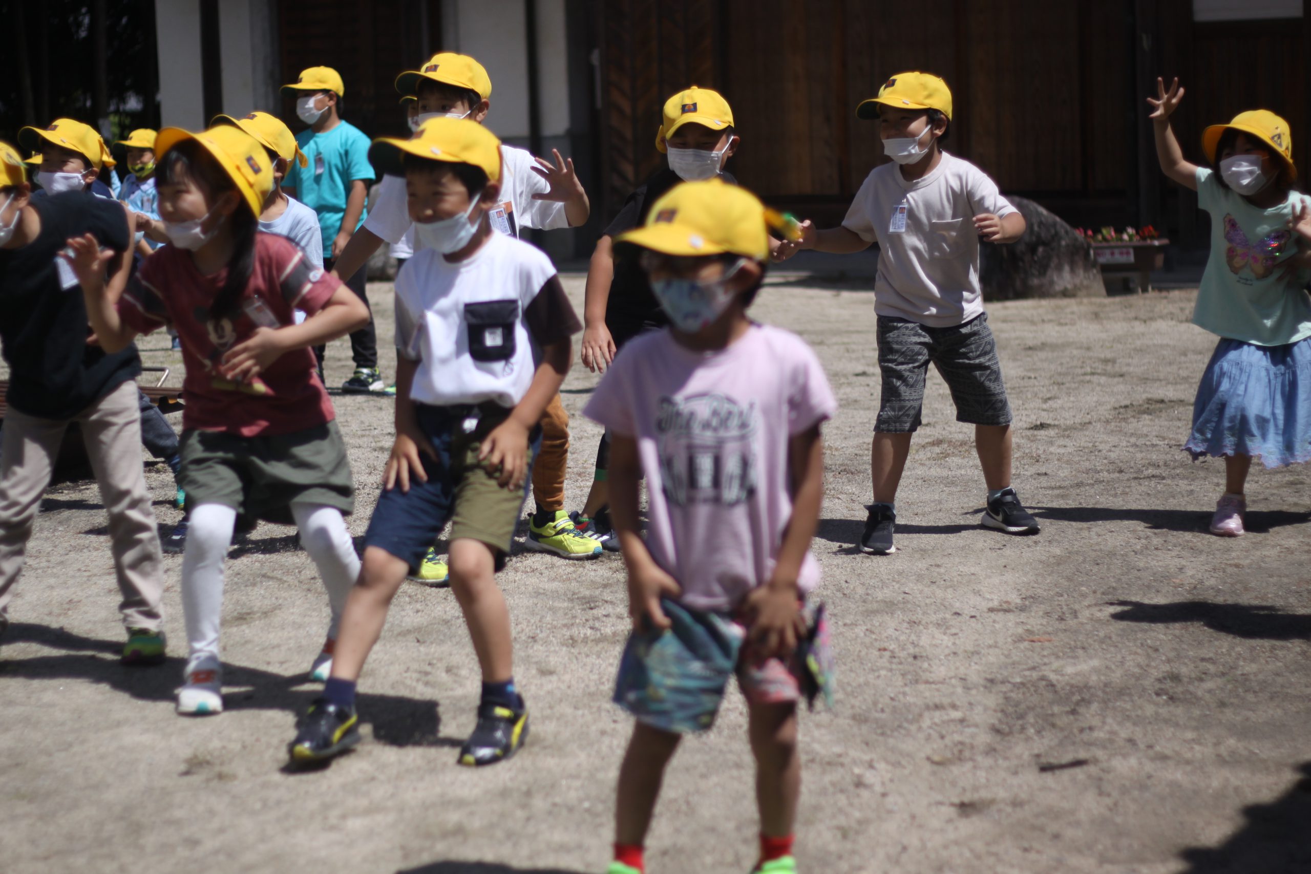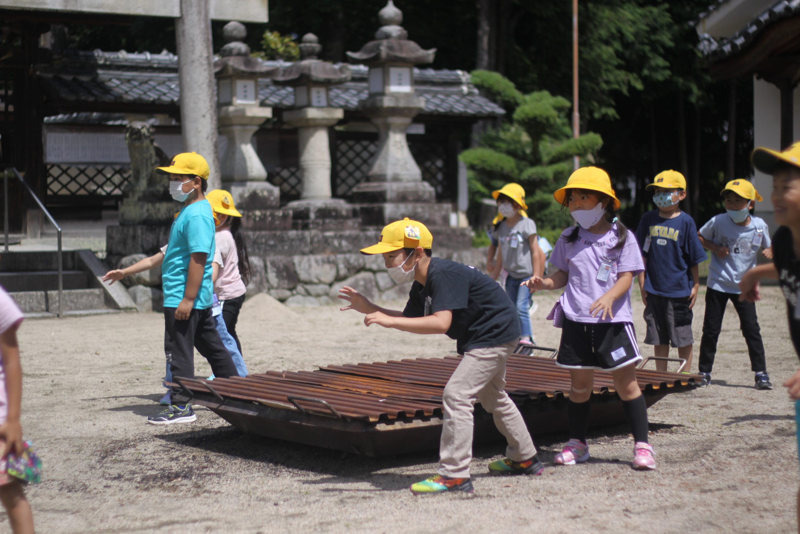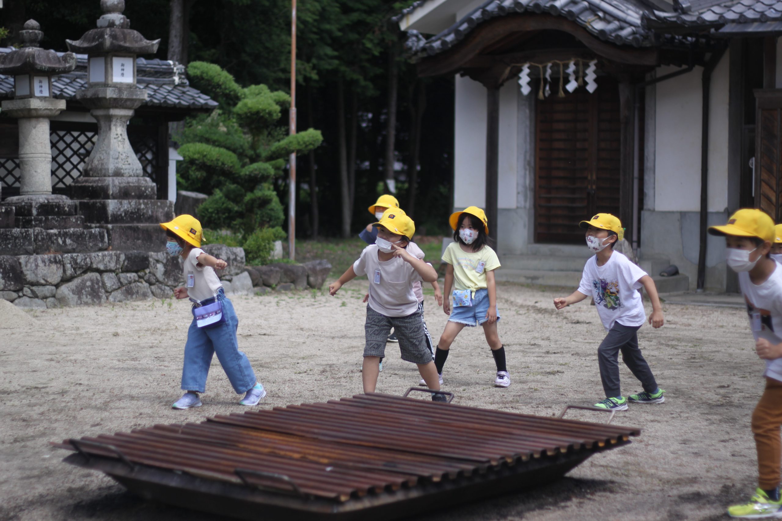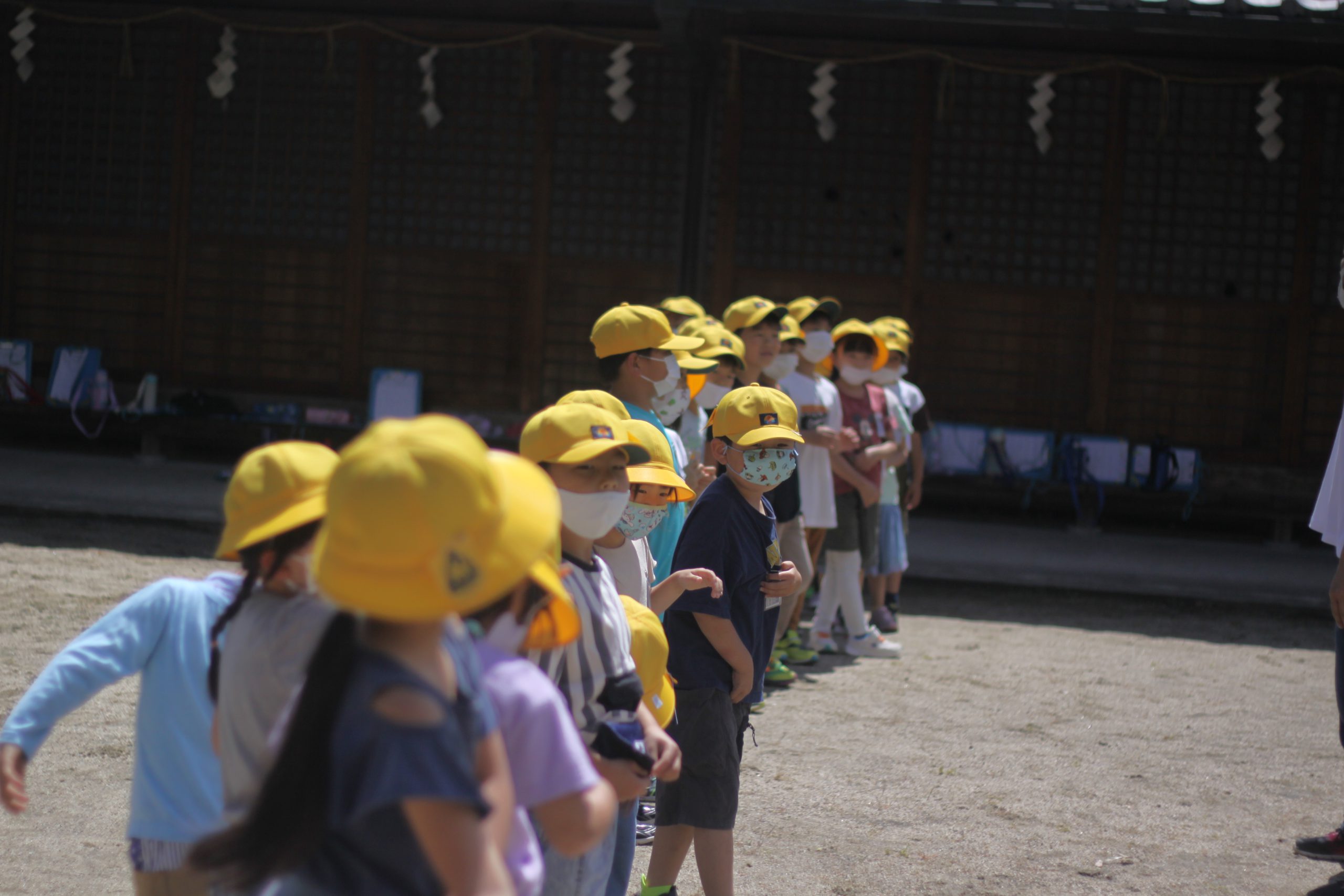 校区にある高向神社。今日は1年生が高向神社までお散歩をして、高向神社の中をプチ探検しました。「ふわふわ、ぷちぷち、つるつるなど」するものをグループで探し回りました。探検の前には「猛獣狩り」「だるまさんがころんだ」などみんな遊びもしました。とても楽しい時間になりました。
